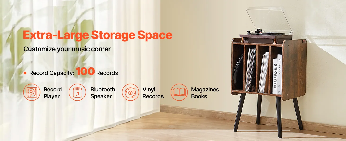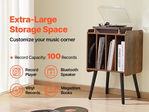 Elegant Display: The spacious record player stand maximize space, making it easy to organize up to 100 albums. Keep your music collection neat and accessible with this stylish record player stand!