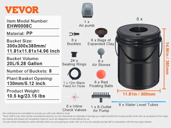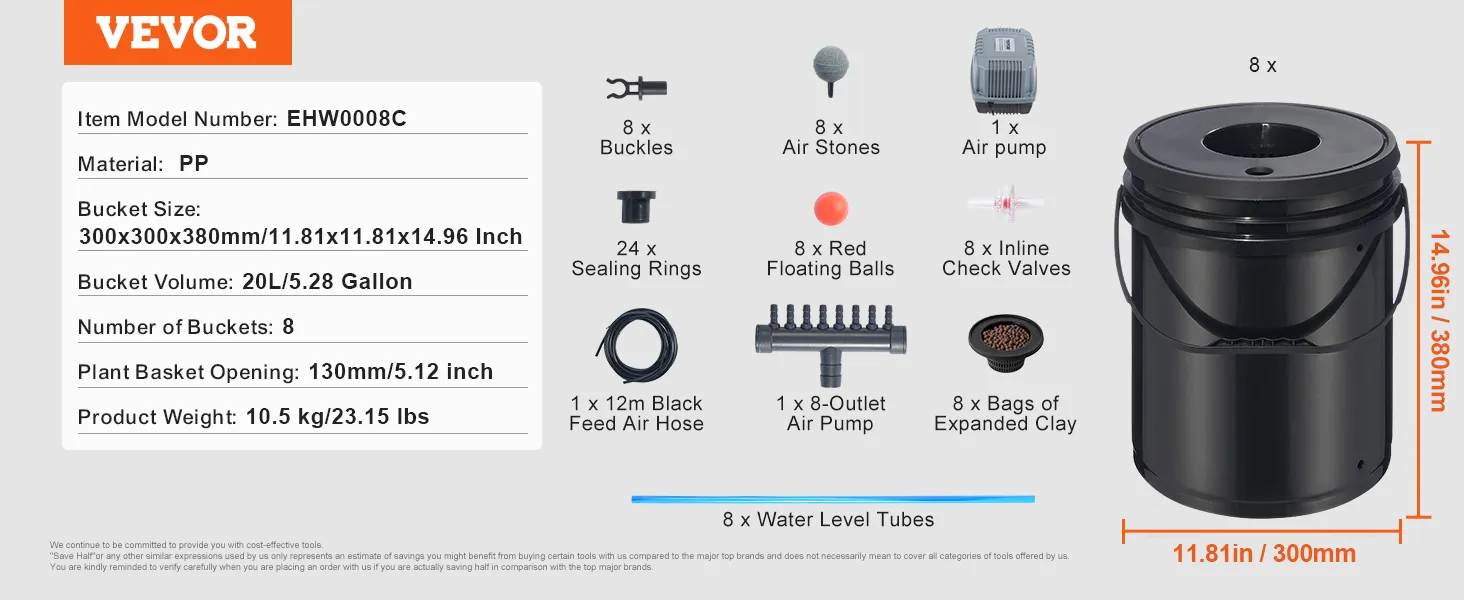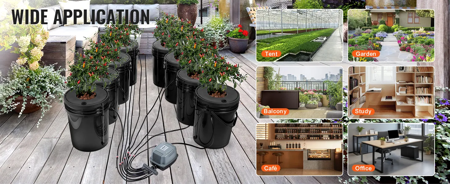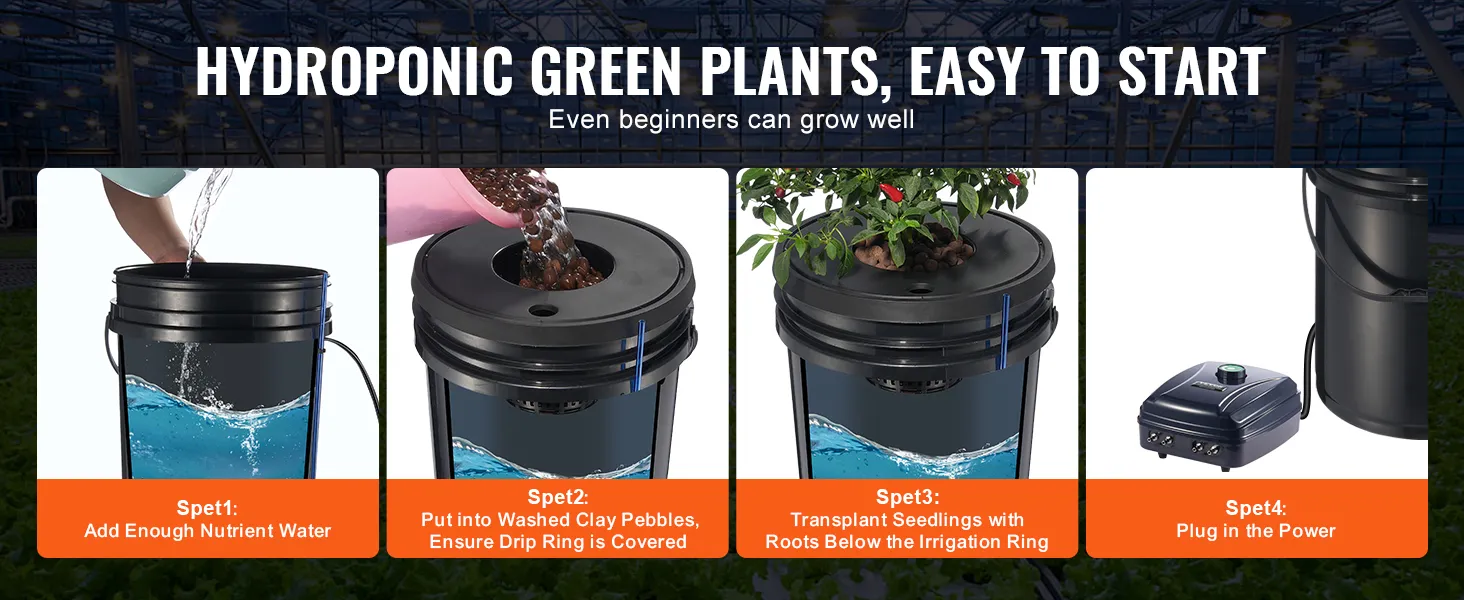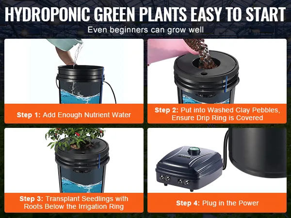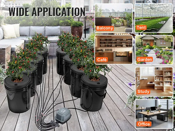 Krachtige luchtpomp en luchtstenen: Vermogen luchtpomp: 8 W. Luchtstroom: 4 x 4 L/min. De luchtpomp en luchtstenen voor diepwatercultuur voorzien elke emmer van overvloedige zuurstof via luchtslangen, waardoor de wortels worden ondergedompeld in voedselrijk, zuurstofrijk water voor een snellere en gezondere ontwikkeling.