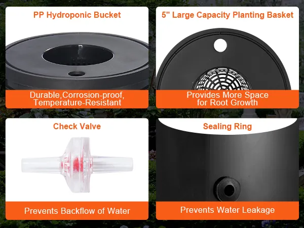 PP-hydrocultuuremmers zijn stevig en duurzaam, plantenmanden bieden planten meer ruimte voor wortelgroei. Afdichtringen en terugslagkleppen voorkomen effectief waterlekken en terugstroming.