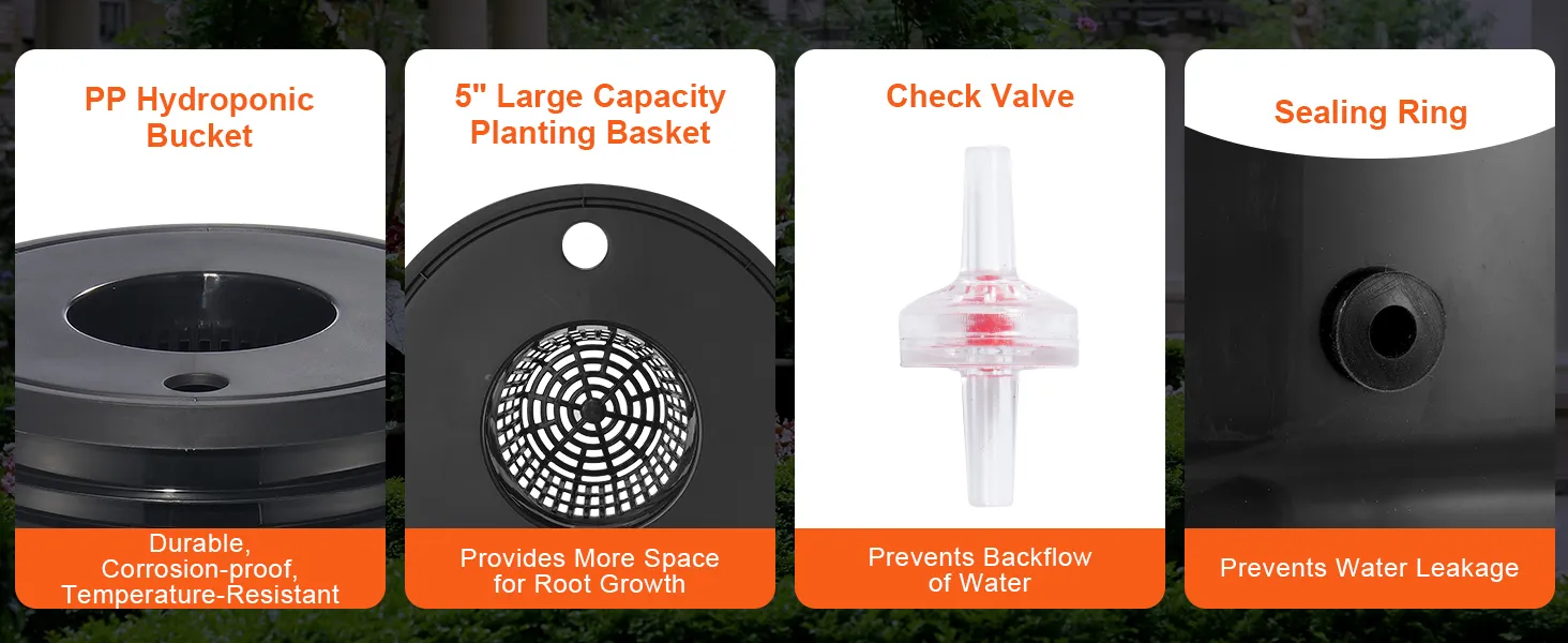 Gebruiksvriendelijk ontwerp: onze hydrocultuuremmer bevat afdichtringen om waterlekken te voorkomen. Voorgesneden waterpeilbuizen met uniforme lengte voorkomen lekken en een terugslagklep voorkomt terugstroming met hoogwaardige kleppen voor een betere afdichting.