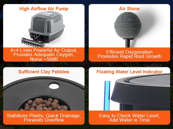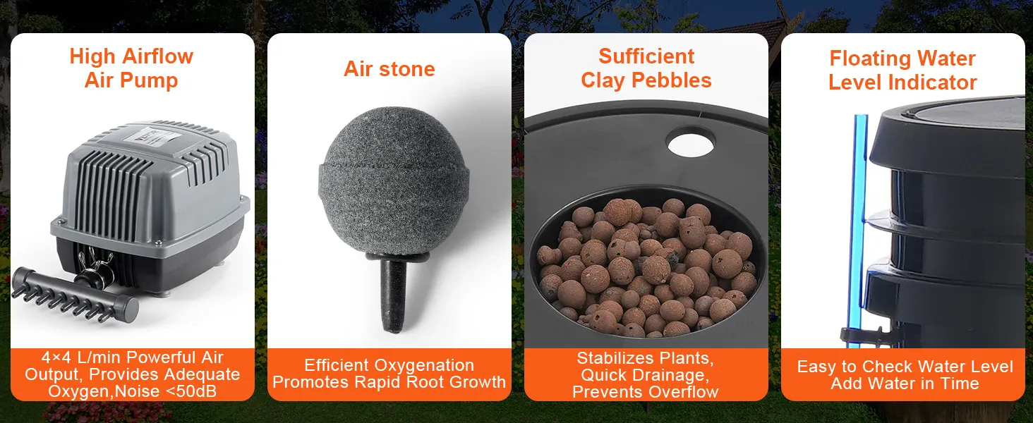 De luchtpomp en luchtsteen leveren een grote hoeveelheid zuurstof. Geëxpandeerde klei kan de planten op hun plaats houden en ze snel laten uitlekken. De drijvende waterniveau-indicator zorgt voor een gemakkelijke weergave en herinnert u eraan om op tijd water bij te vullen.