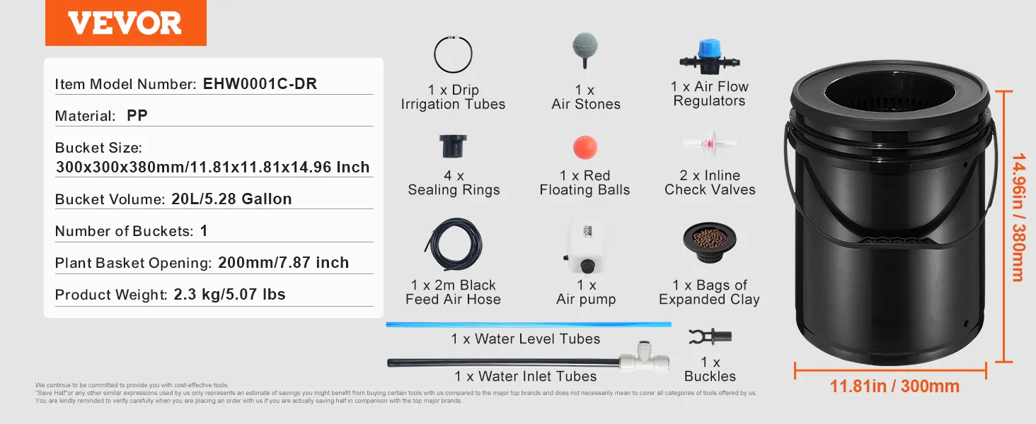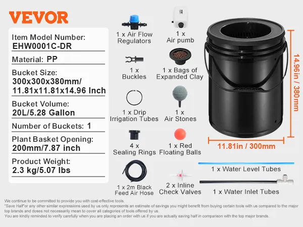 Complete DWC Hydroponic Kit: This DWC hydroponic planting system includes PP planting bucket, check valve, air pump, black feed air tubing, air stone, sealing rings, water level tube, drip irrigation tube, water inlet tube, bag of expanded clay, air flow regulator, and assembly instruction, making installation very convenient.
