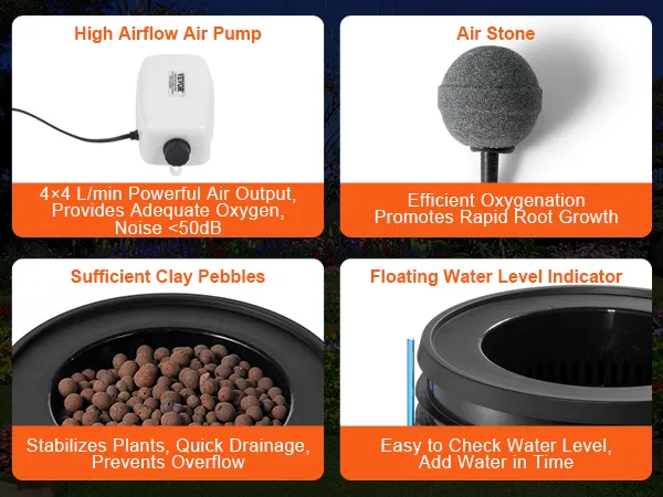 The air pump and air stone provide a large amount of oxygen. Expanded clay can fix the plants, drain quickly, and prevent overflow of the water level tube. Floating water level indicator makes easy viewing, reminds adding water in time.