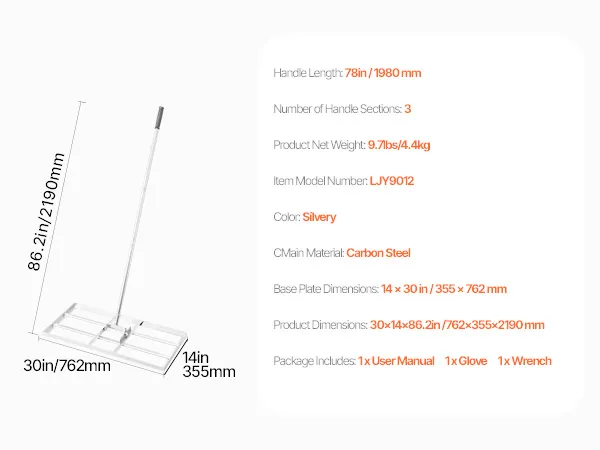 Eenvoudige montage: In de verpakking vindt u een gebruiksaanwijzing, handschoenen en een montagesleutel waarmee u de egalisatiehark snel kunt monteren en demonteren. Lijn de schroefdraad van de hendel eenvoudig uit, schroef deze vast en draai deze vast. Bevestig de basis en de plaat met schroeven en draai ze vast met een sleutel. De installatie is eenvoudig en moeiteloos.