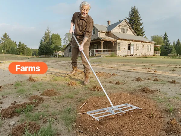 Onze robuuste gazonhark met brede bodemplaat egaliseert de grond efficiënt. Het harde koolstofstaal met roestwerend oppervlak en stevige lasnaden garandeert een lange levensduur buitenshuis. De 180° draaibare handgreep met rubberen hoes zorgt voor een comfortabele grip. Ideaal voor boerderijen, tuinen en golfbanen.