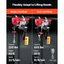 200 kg draagvermogen: deze elektrische takel kan gemakkelijk kleine motoren, tandwielen, groot werkplaatsgereedschap of bouwmaterialen optillen. Laadvermogen: 220 lbs/100 kg (enkele kabel), 440 lbs/200 kg (dubbele kabel).