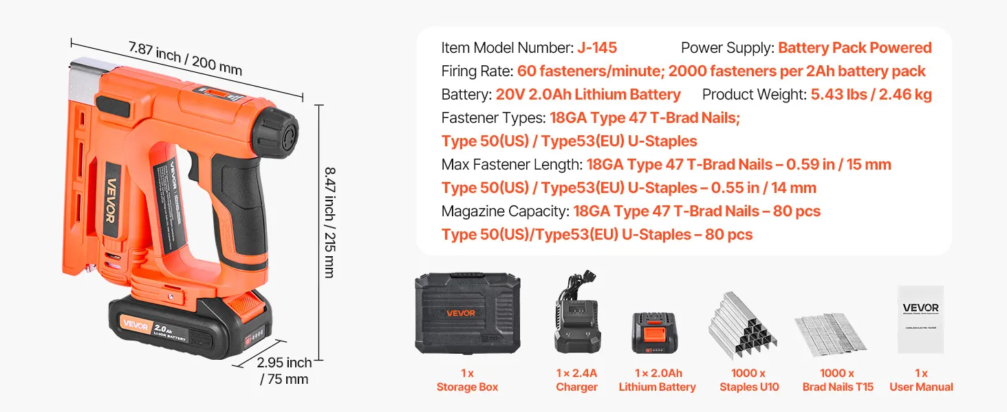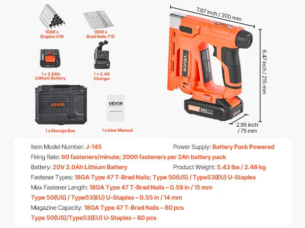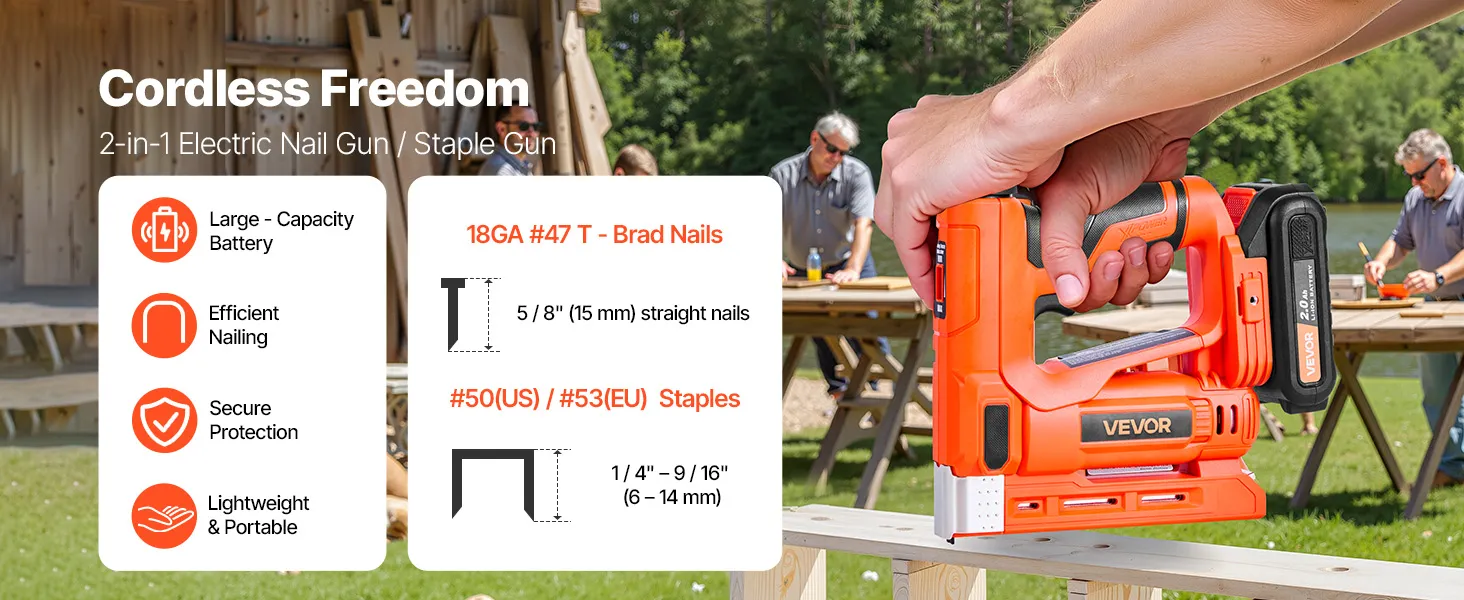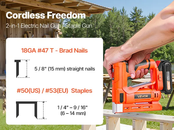 2-in-1-compatibiliteit: dit snoerloze 2-in-1 elektrische spijkerpistool werkt als een brad-spijkermachine en nietmachine en ondersteunt 18GA Type 47 T-brads (5/8 inch / 15 mm) en Type 53 U-nieten (1/4 tot 9/16 inch / 6 tot 14 mm)