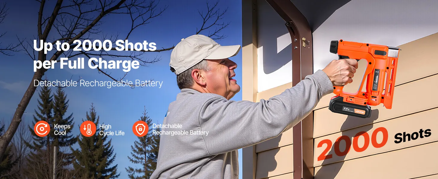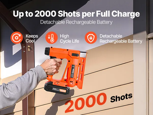 Deze accuspijkermachine is voorzien van een krachtige accu die tot wel 2000 spijkers op een volle accu kan schieten. De accu gaat lang mee en blijft koel tijdens gebruik, zodat u langdurig onafgebroken kunt werken.