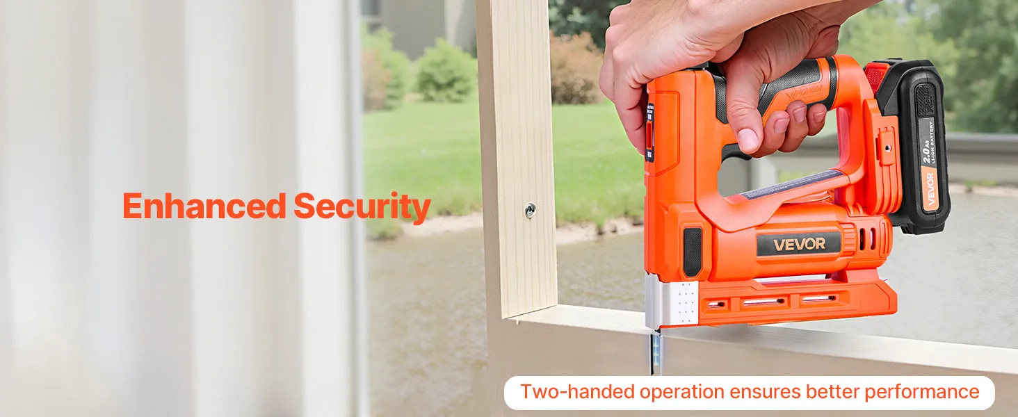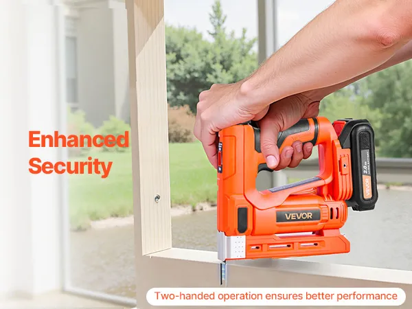 Veiligheidsvoorzieningen: Deze elektrische nietmachine is voorzien van een aan/uit-schakelaar, contactpunt en trekkervergrendeling om onbedoeld afvuren te voorkomen. Hij werkt alleen wanneer hij tegen het werkoppervlak wordt gedrukt en de antislip rubberen grip helpt vermoeidheid te verminderen tijdens langdurige klussen.