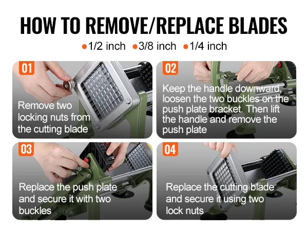 Durable Blades: Our french fry cutter utilizes upgraded food-grade 420J2 stainless steel blades in 1/2 inch and 3/8 inch sizes, enabling effortless cutting of vegetables like potatoes, carrots, cucumbers, and even tougher vegetables like sweet potatoes.