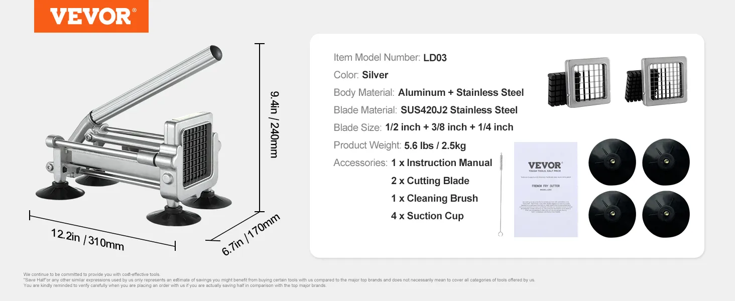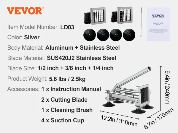 VEVOR French Fry Cutter, Potato Slicer with 1/2" 3/8" 1/4" Stainless Steel Blades, Manual Potato Cutter Chopper with Suction Cups, Great for Potato, French Fries, Cucumber, Vegetables, Carrot