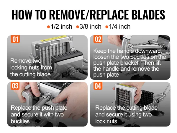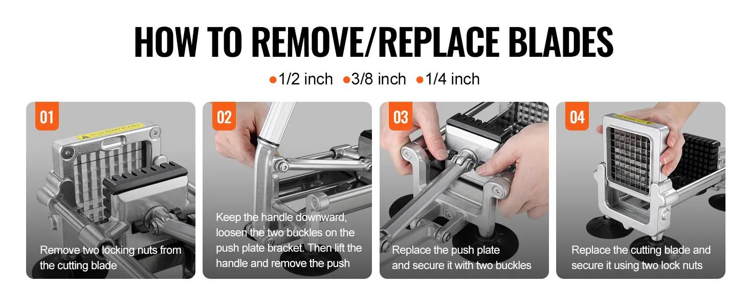 Durable Blades: Our french fry cutter utilizes upgraded food-grade 420J2 stainless steel blades in 1/2 inch, 3/8 inch, and 1/4 inch sizes, enabling effortless cutting of vegetables like potatoes, carrots, cucumbers, and even tougher vegetables like sweet potatoes.