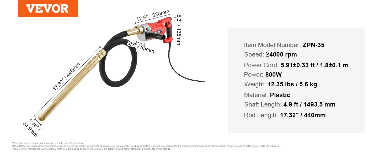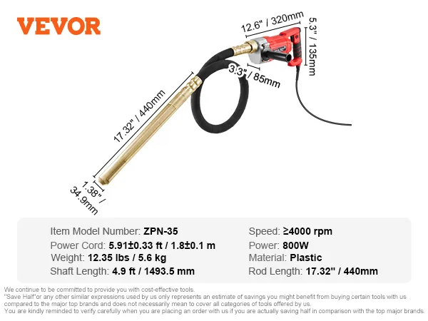 • Enhanced Vibrational Transfer: Vibrating Head Length: 1.81 inch. Head Diameter: 1.38 inch. With its quiet and long 4.9 ft shaft, along with a 5.91 ft power cord, the concrete vibrating tool can be easily used on various construction sites, even if you are far from a power outlet.