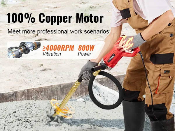 • High Frequent Vibration: With a 800W copper motor generating 4000RPM , our concrete vibrator effectively removes air from the concrete. This process ensures uniform compaction, reducing the risk of cracks, enhancing the structure's load-bearing capacity, and extending its overall lifespan.