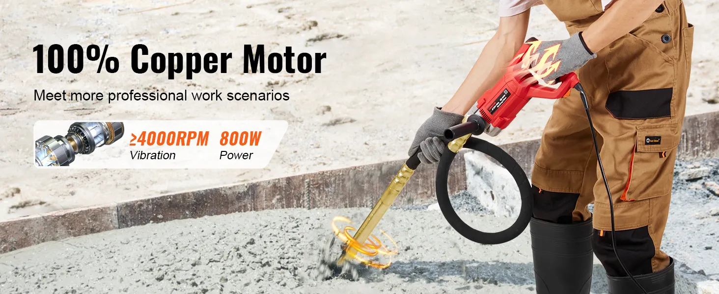 Equipped with a copper motor, it delivers a vibration frequency of 4000RPM and effectively transmits vibrations through the concrete, ensuring uniform distribution and tight compaction.