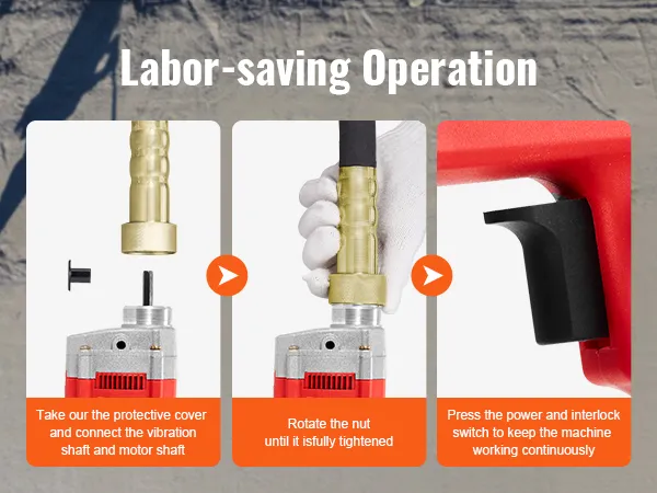 • Effortless Operation: Our handheld concrete vibrating tool is designed to be lightweight and easily transportable. The threaded interface simplifies the attachment process, allowing for quick and effortless connection of the vibrating head or shaft to the concrete vibrator. With its secure and reliable threaded design, all you need to do is tighten it, and you're ready to go!