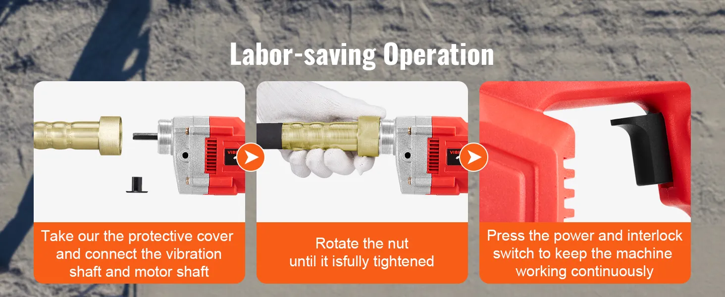 • One-Key Control: Thanks to the locking button, the electric concrete vibrator can be operated without the need to keep pressing the trigger, allowing you to work for longer durations comfortably, leading to increased productivity and reduced strain on the body.