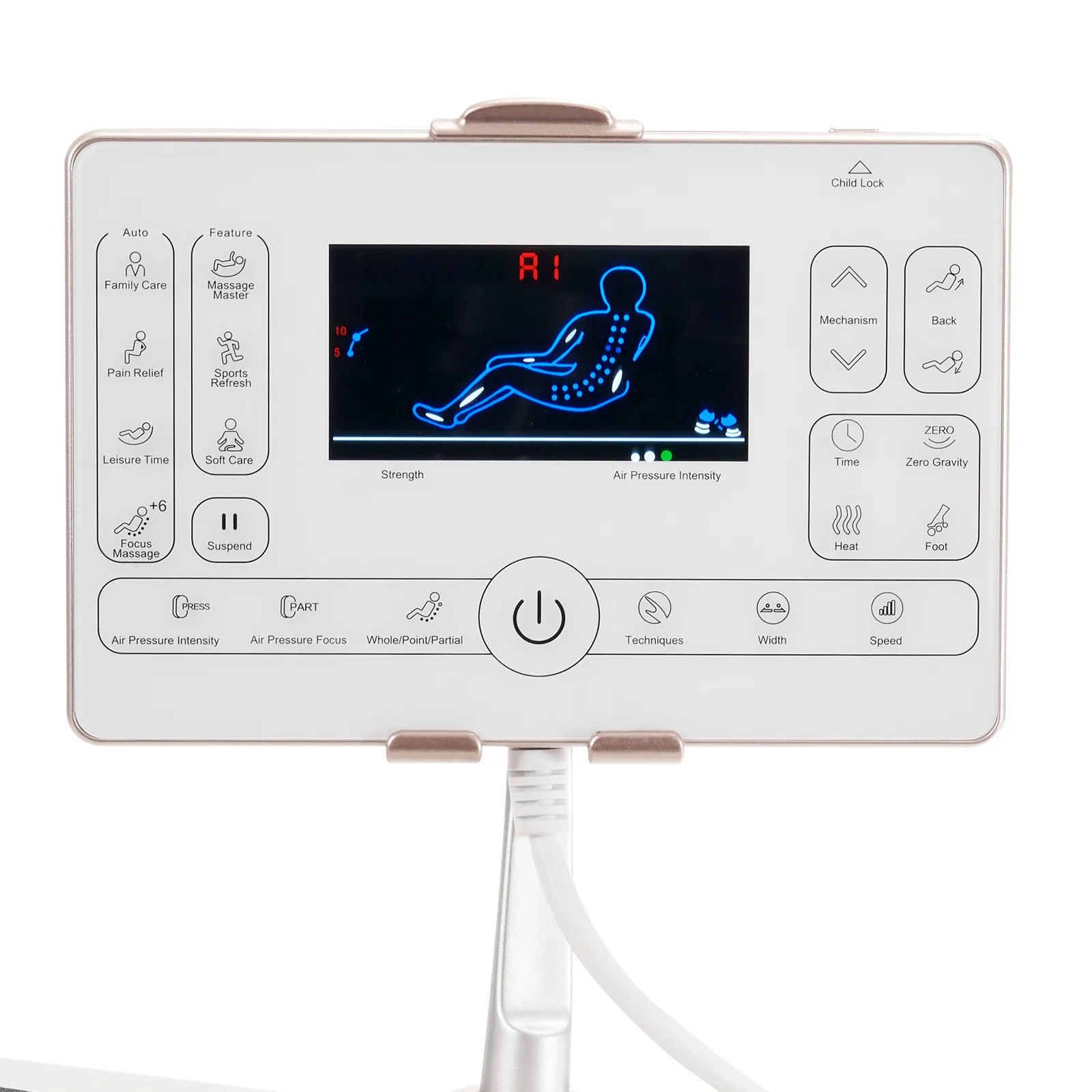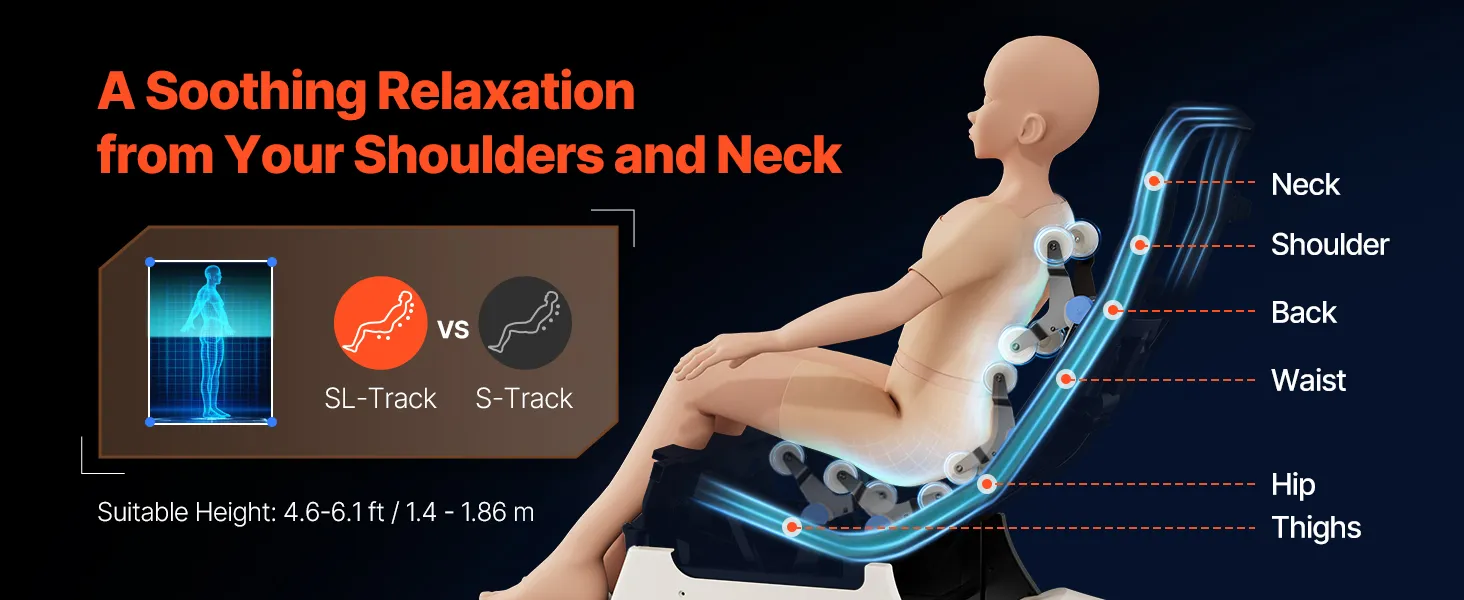 Volledige lichaamsbedekking: de ergonomische SL-rail past zich aan uw lichaam aan en is geschikt voor gebruikers van 1,4 tot 1,86 m (1,4 tot 1,86 m). Met 36 airbags en 5 instelbare niveaus biedt het een uitgebreide massage-ervaring