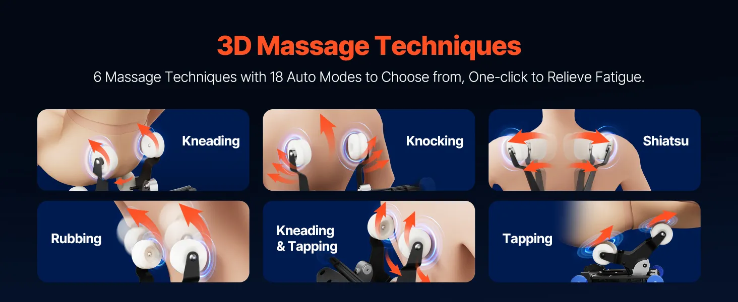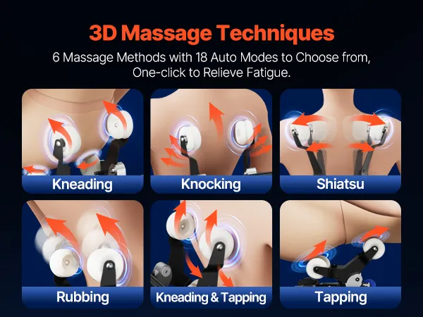 Realistische massage: De 3D-massagerollen simuleren professionele technieken zoals kneden, kloppen, acupressuur, kneed-klopmassage en percussie met 6 massagemethoden. Samen met 18 automatische modi verlicht het spiervermoeidheid en verbetert het de bloedsomloop