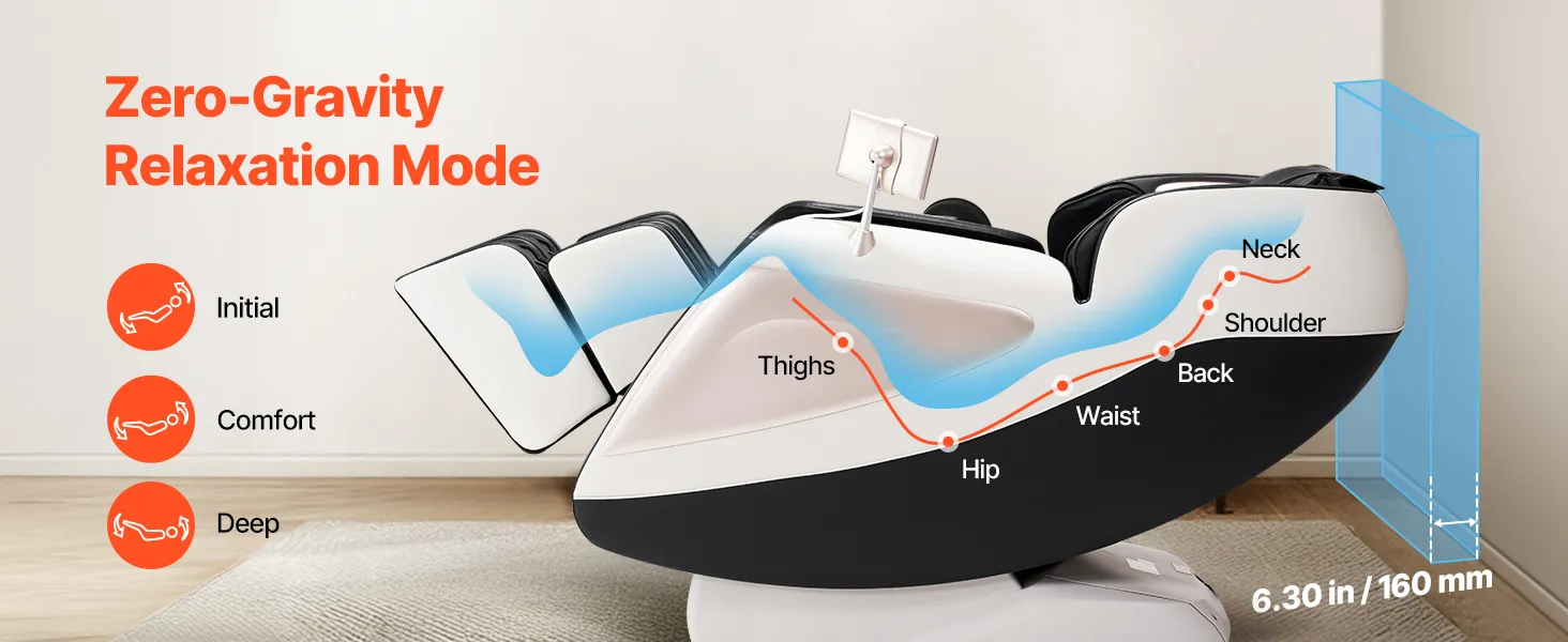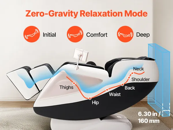 Zero Gravity Experience: Met drie kantelhoeken brengt de zero gravity-positie uw knieën boven uw hart. Dit vermindert de druk op de wervelkolom en bevordert de bloedsomloop. Het verlicht de hartklachten en is ideaal voor de dagelijkse behandeling van hernia's
