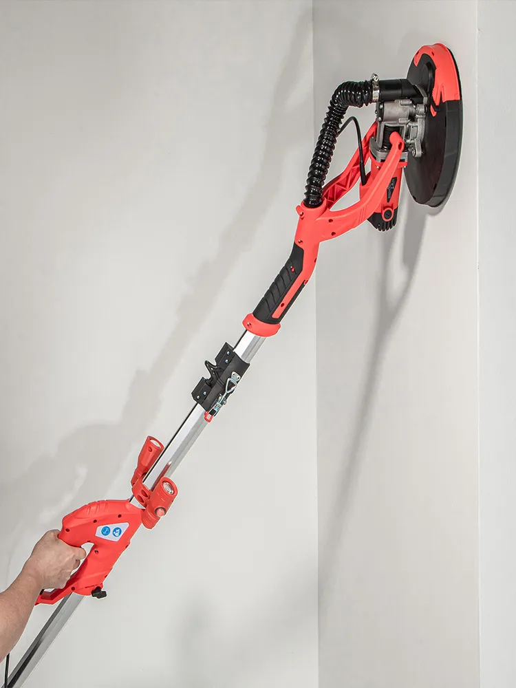 Deze 8 50W elektrische schuurmachine heeft een telescopisch frame, uitschuifbaar van 1,4 m tot 1,8 m, geschikt voor verschillende werkruimtes, het slijpen van het plafond is eenvoudig. En het gereedschap is opvouwbaar, handig voor transport en opslag.