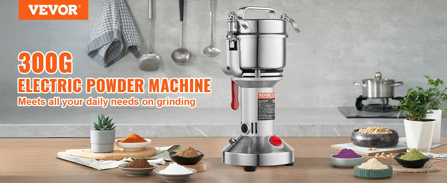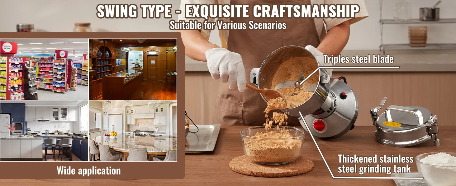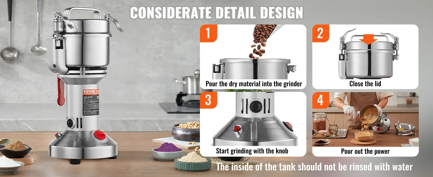 Multifunctionele droogmolen: de poedermachine kan verschillende gedroogde materialen verwerken, waaronder ① granen (soja, maïs, gerst, tarwe, haver, rogge, erwten, koffiebonen) ② specerijen (venkel, peper, kaneel, rozemarijn) ③ andere ( als je andere harde materialen hebt, snij ze dan eerst in kleine stukjes). (Niet geschikt voor natte, verse, olieachtige of plakkerige materialen.) Veel gebruikt in huizen, keukens, ziekenhuizen en farmaceutische fabrieken.