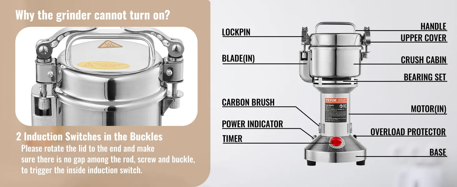 Verbeterd dubbel veiligheidsconcept: de tarwemolen stopt automatisch wanneer het deksel wordt geopend, wat de veiligheid vergroot en de gebruiker tegen letsel beschermt. Wanneer de molen overbelast is, wordt de overbelastingsbeveiliging automatisch geactiveerd om de werking te regelen. Ook is de molen voorzien van een timer van 0-5 minuten, waardoor hij gemakkelijk in gebruik is.
