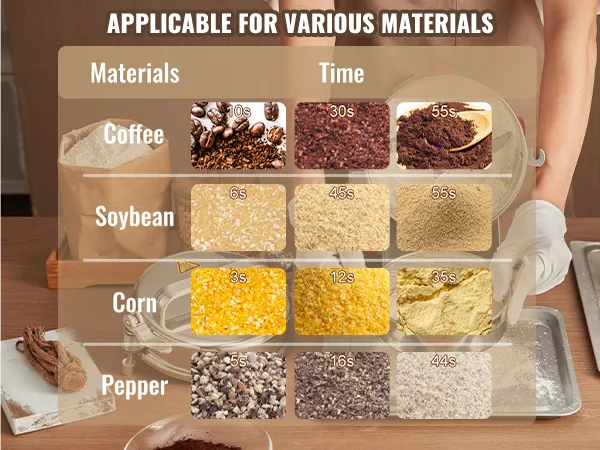 Multipurpose Dry Grinder: The powder machine can deal with various dried materials, including ① grains (soy, corn, barley, wheat, oats, rye, peas, coffee beans), ② spices (fennel, pepper, cinnamon, rosemary), (Not suitable for wet, fresh, oily, or sticky materials.) It is widely used in families, kitchens, hospitals, and medicine processing factories.