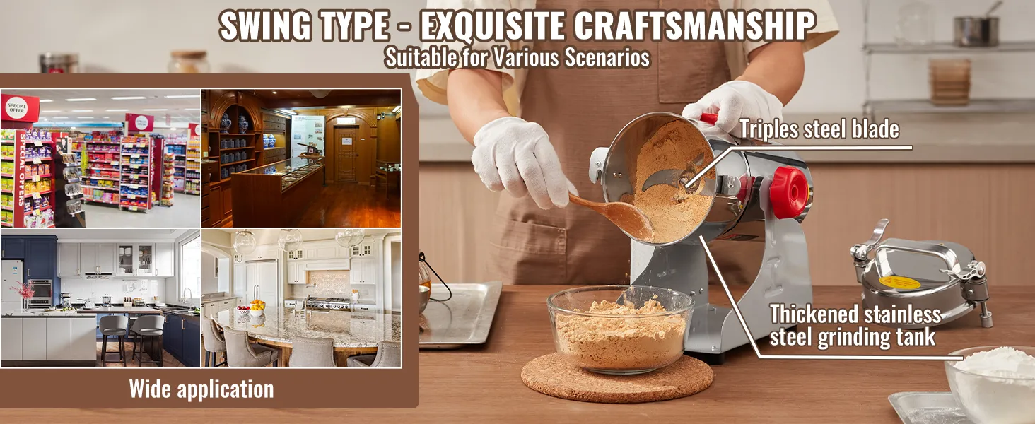 Swing Grinder: The swing type is more convenient than the upright type. You could swing the commercial spice grinder body 270° to help pour instead of picking up the grinder. In addition, you can swing the grinder when working, producing more uniform and fine powders. If you are unsatisfied with the grinding effect, you can sieve out coarse particles and grind them again for finer results.