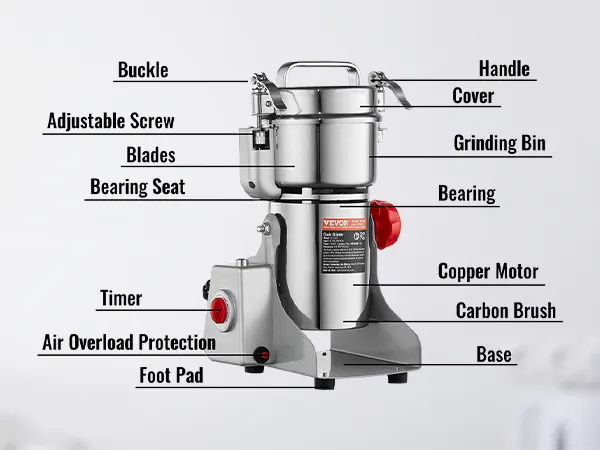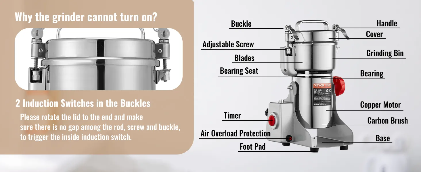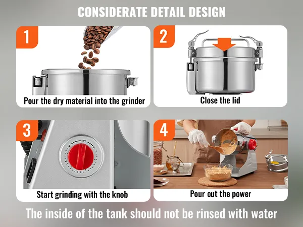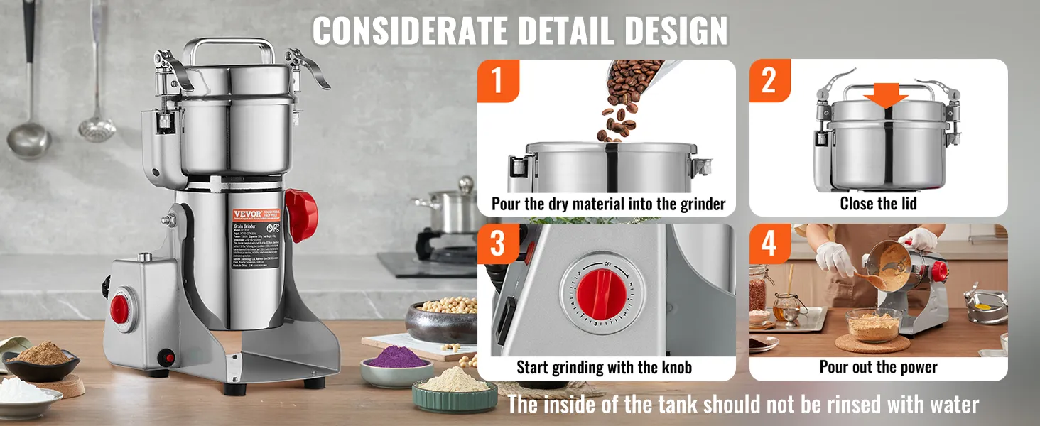 Stainless Steel Material & Secure Designs: The electric small spice grinder is made of food-grade stainless steel, featuring durability and no processing pollution. The buckle structure features good sealing and high-security ability. The wheat berry grinder automatically stops when the lid is opened, enhancing security and protecting the user from injury. When the grain grinder is overloaded, the overload protector will work automatically to control the operation.