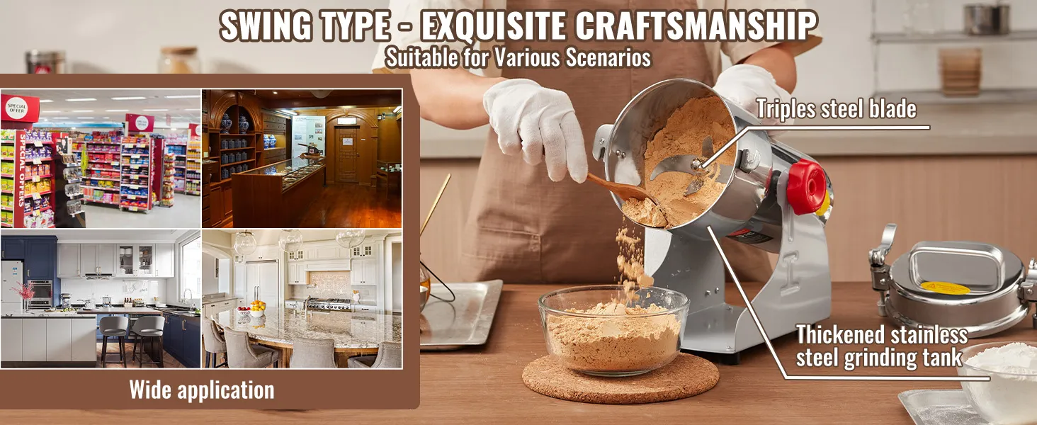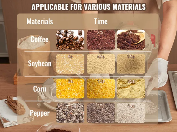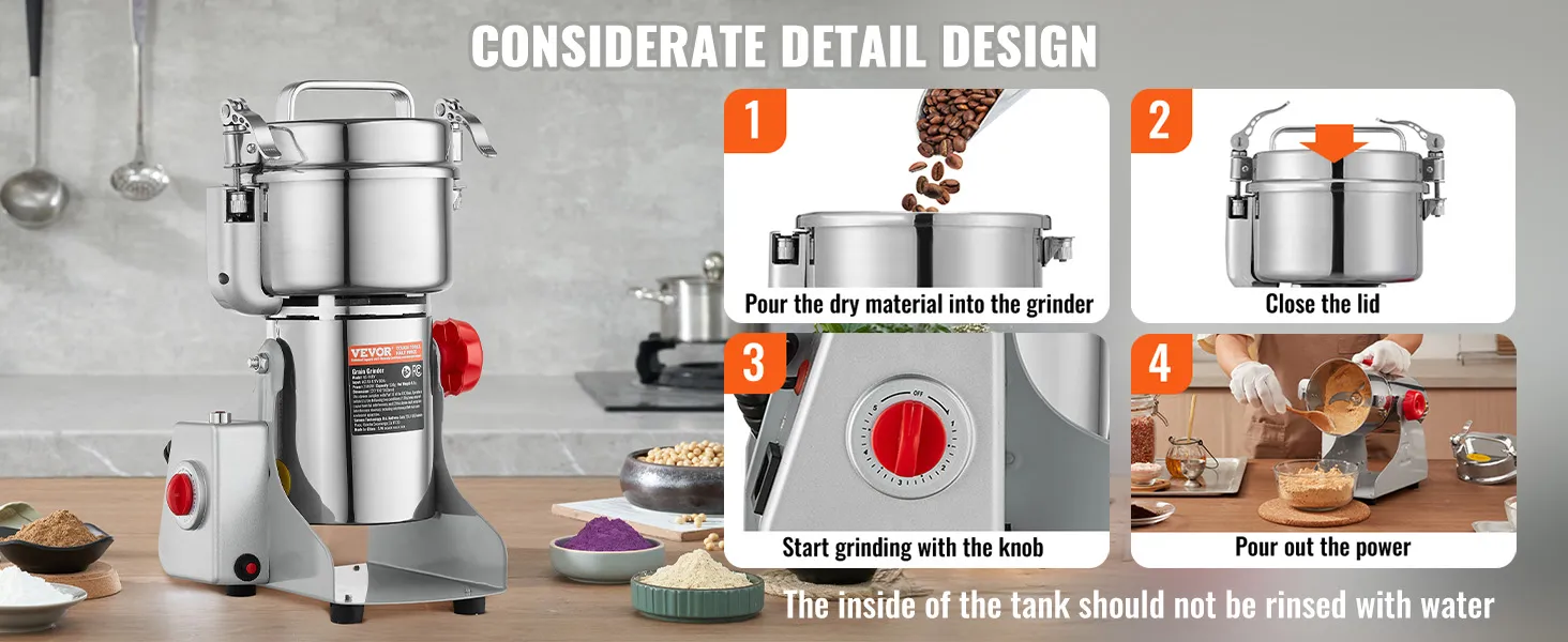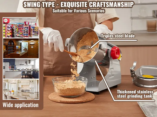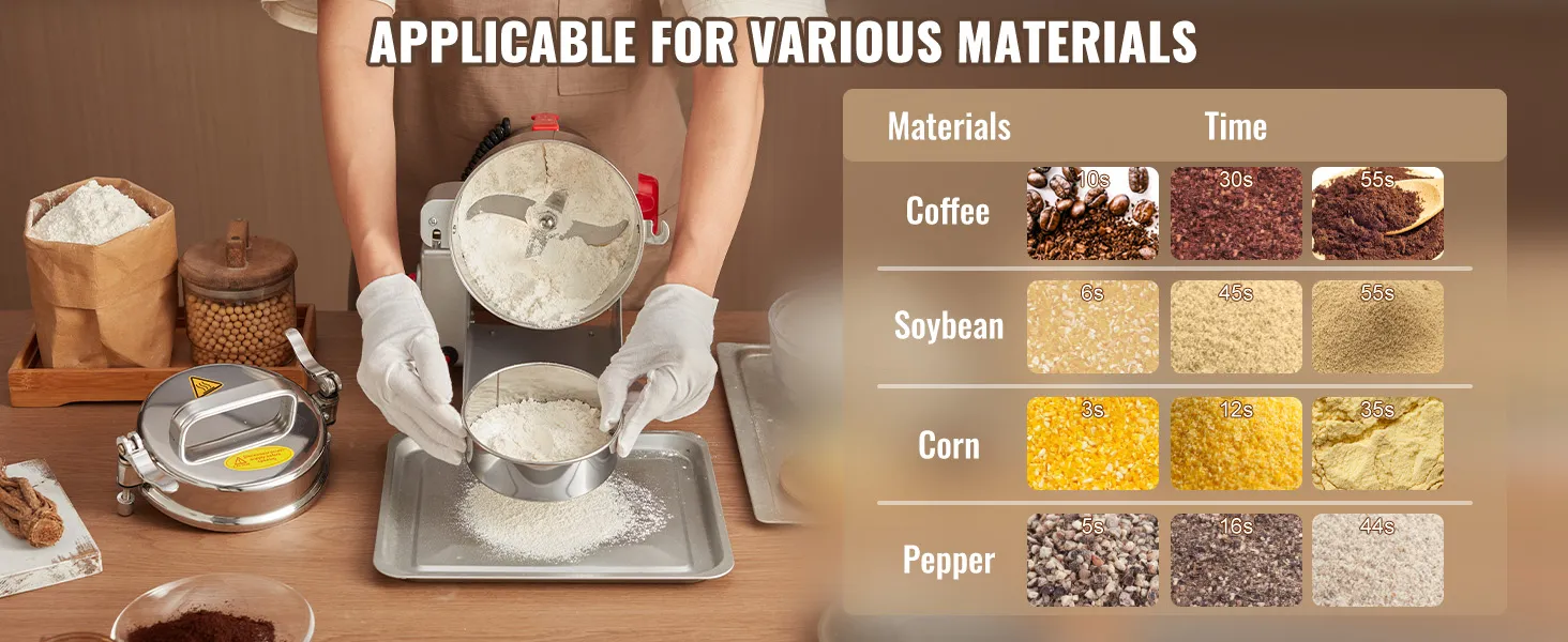 Multifunctionele droogmolen: de poedermachine kan verschillende gedroogde materialen verwerken, waaronder ① granen (soja, maïs, gerst, tarwe, haver, rogge, erwten, koffiebonen), ② specerijen (venkel, peper, kaneel, rozemarijn), ( Niet geschikt voor natte, verse, olieachtige of plakkerige materialen.) Het wordt veel gebruikt in huizen, keukens, ziekenhuizen en farmaceutische verwerkingsfabrieken.