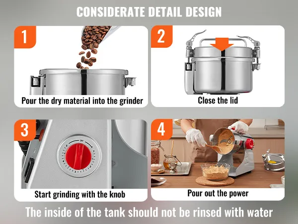 Gebruiksaanwijzing: 1. Deze commerciële koffiemolen mag alleen worden ingeschakeld als het deksel volledig gesloten is. 2. Het grondmateriaal moet voldoende droog zijn. 3. Laat de machine na elke 5 minuten gebruik 5 tot 10 minuten rusten. 4. Zorg ervoor dat de maling het lange mes en niet meer dan 2/3 van de container bedekt. De helft van de container is het beste. 5. Maak de maalcontainer niet rechtstreeks met water schoon. Gebruik een droge doek of borstel om schoon te maken.