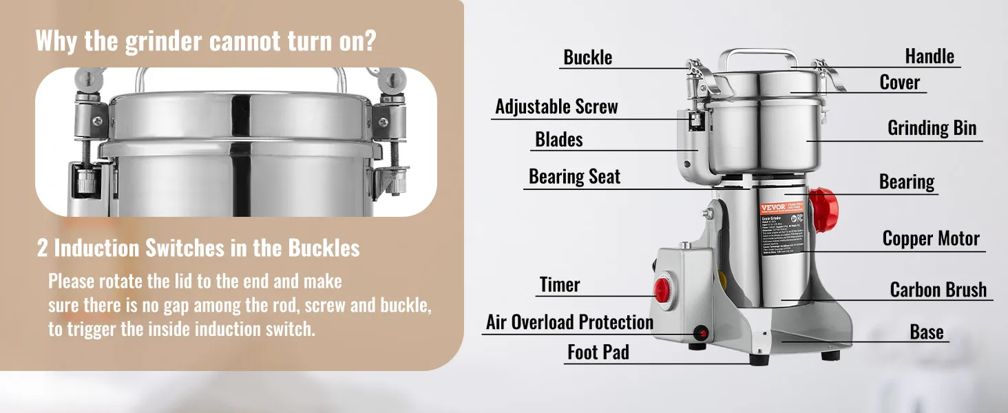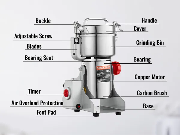 Materiaal van roestvrij staal en veilig ontwerp: de kleine elektrische kruidenmolen is gemaakt van roestvrij staal van voedingskwaliteit en wordt gekenmerkt door zijn duurzaamheid en vrijheid van verontreiniging. De behuizing is goed afgesloten en biedt een hoog beveiligingsniveau. De graanmolen stopt automatisch wanneer het deksel wordt geopend, waardoor de veiligheid wordt vergroot en de gebruiker tegen letsel wordt beschermd. Wanneer de molen overbelast is, wordt de overbelastingsbeveiliging automatisch geactiveerd om de werking te regelen.