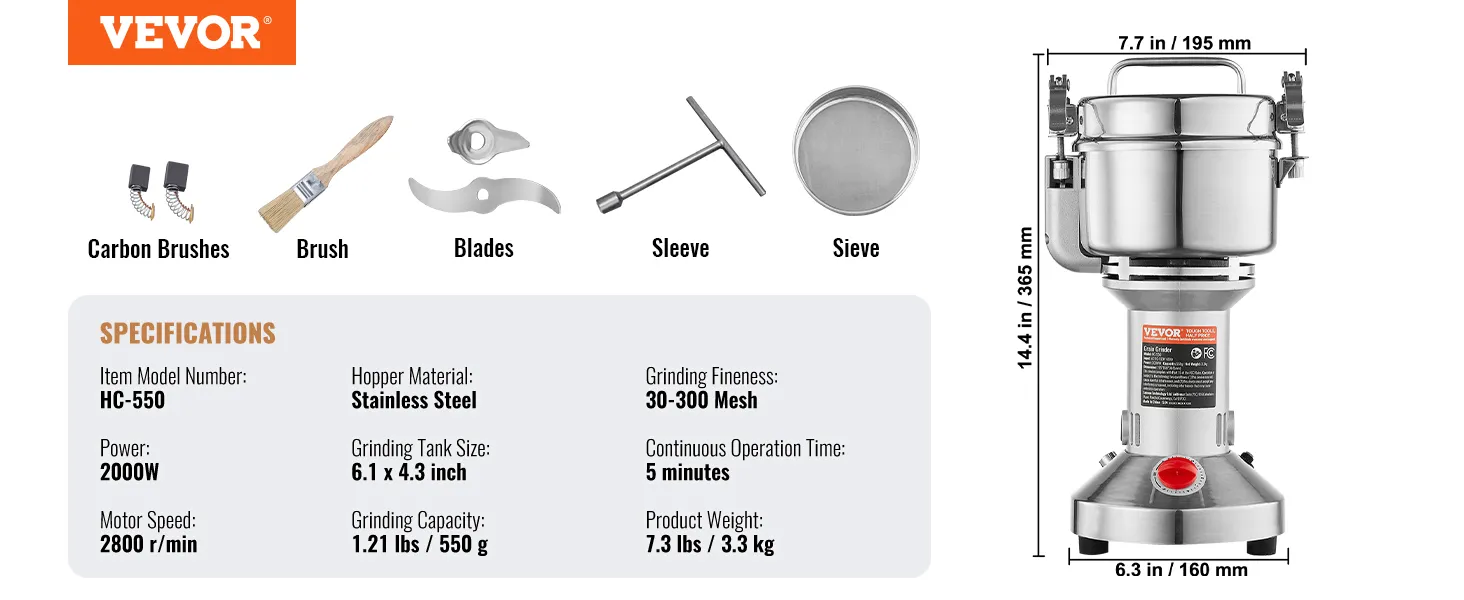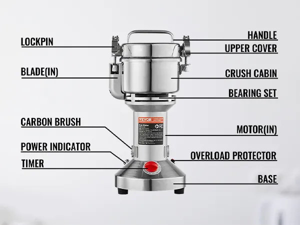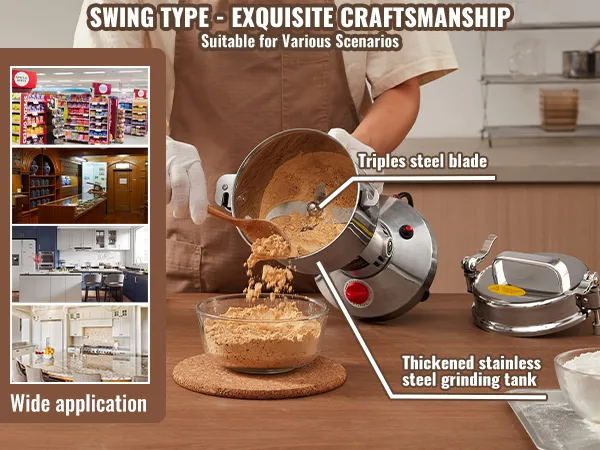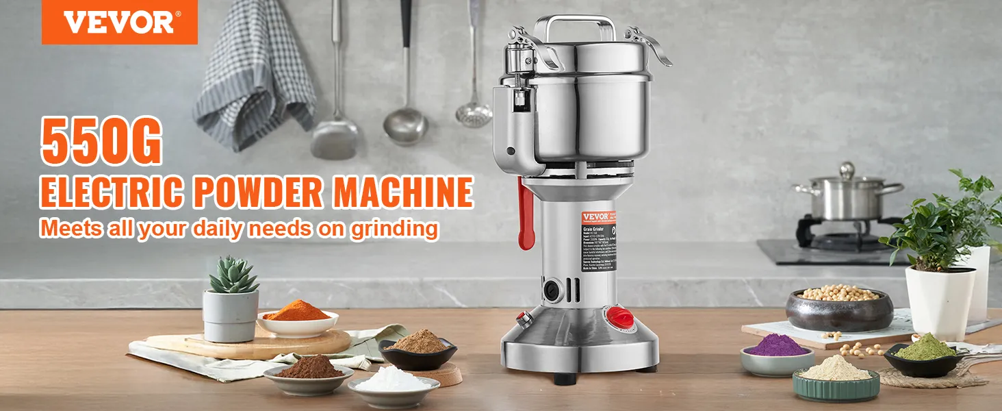 Multifunctionele droogmolen: de poedermachine kan verschillende gedroogde materialen verwerken, waaronder ① granen (soja, maïs, gerst, tarwe, haver, rogge, erwten, koffiebonen) ② specerijen (venkel, peper, kaneel, rozemarijn) ③ andere ( als je andere harde materialen hebt, snij ze dan eerst in kleine stukjes). (Niet geschikt voor natte, verse, olieachtige of plakkerige materialen.) Veel gebruikt in huizen, keukens, ziekenhuizen en farmaceutische fabrieken.