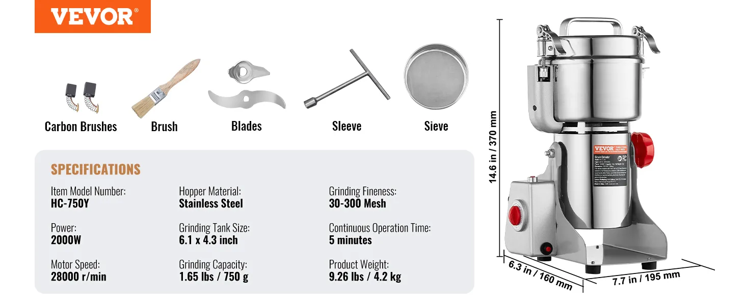 Super Smash-functie: Motorvermogen: 2000 W; Motortoerental: 28000 (tpm); Capaciteit: 750 g; Bedrijfstijd: 5 minuten; Intervaltijd: 10 min; Mate van vermaling: superfijne molen; Principe: hogesnelheidsmolen. Prestaties: 30-300 steken Drielaags mes met breekmes, hoornmes en poederverwijderingsmes. Het duurt slechts 30 seconden om allerlei soorten gedroogd voedsel tot fijn poeder te malen. De kruiden- en zadenmolen is eenvoudig in te stellen en de tijd is af te lezen op het display.