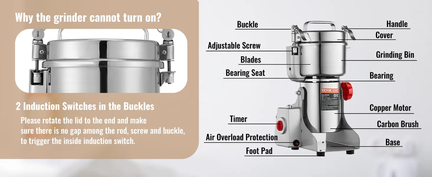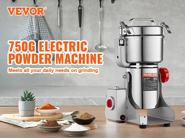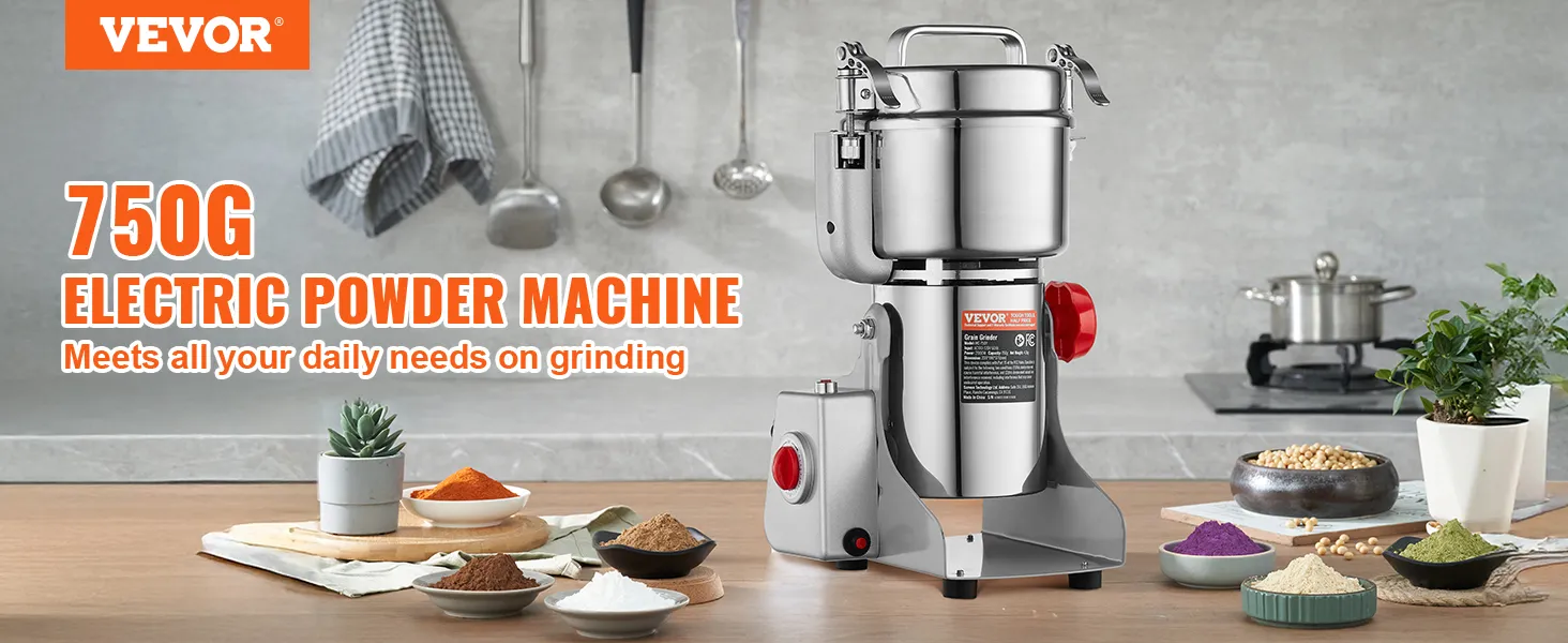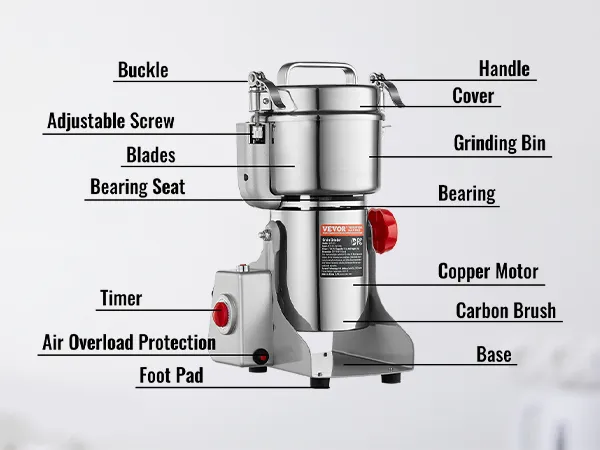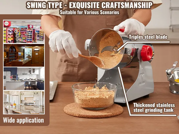 Trilmolen: De trilmolen is praktischer dan de staande molen. U kunt het lichaam van de commerciële kruidenmolen 270° draaien om het gieten gemakkelijker te maken, in plaats van de molen op te tillen. Bovendien kun je de molen tijdens het werken draaien, waardoor er gelijkmatigere en fijnere poeders ontstaan. Als u niet tevreden bent met het maalresultaat, kunt u de grove deeltjes eruit zeven en opnieuw malen voor een fijner resultaat.