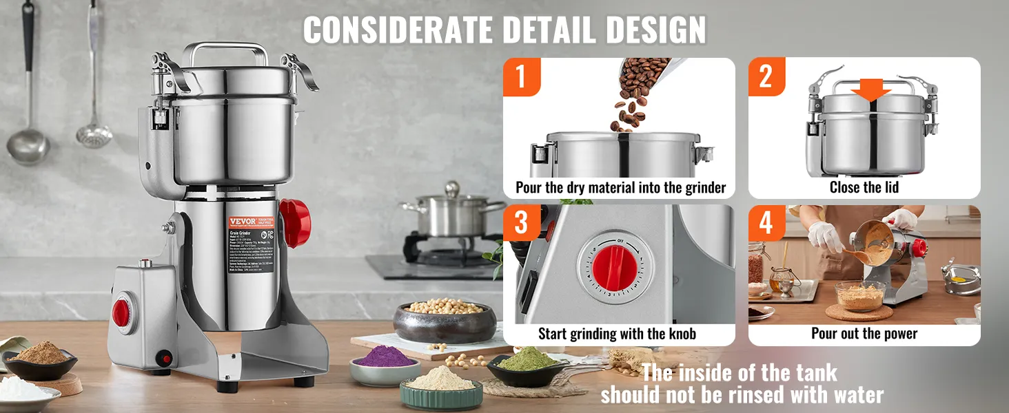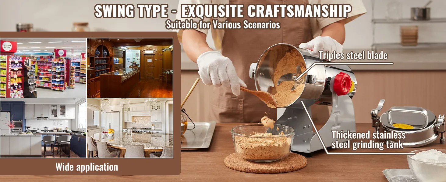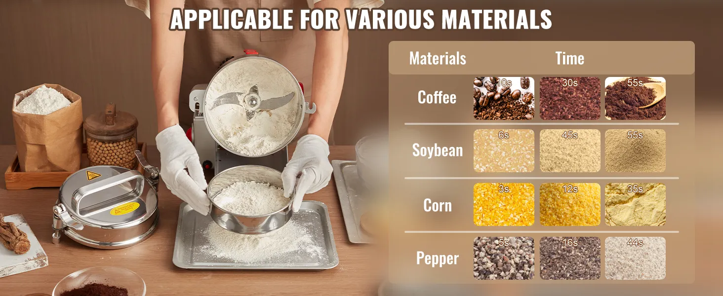 Multifunctionele droogmolen: de poedermachine kan verschillende gedroogde materialen verwerken, waaronder ① granen (soja, maïs, gerst, tarwe, haver, rogge, erwten, koffiebonen), ② specerijen (venkel, peper, kaneel, rozemarijn), ( Niet geschikt voor natte, verse, olieachtige of plakkerige materialen.) Het wordt veel gebruikt in huishoudens, keukens, ziekenhuizen en medicijnverwerkingsfabrieken.