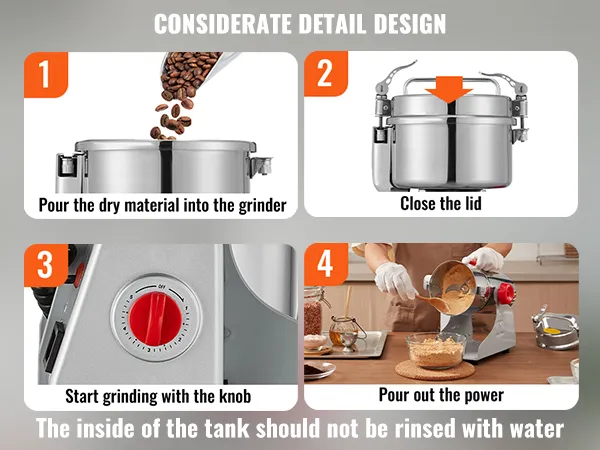 Tips voor gebruik: 1. Deze commerciële koffiemolen kan alleen worden ingeschakeld nadat het deksel volledig gesloten is. 2. De te malen materialen moeten voldoende droog zijn. 3. Laat de machine na elke 5 minuten gebruik 5-10 minuten rusten. 4. Zorg ervoor dat het maalmateriaal het lange mes en niet meer dan 2/3 van het vat bedekt. 1/2 van de container is het beste. 5. Maak de maalcontainer niet rechtstreeks met water schoon. Gebruik een droge doek of borstel om de machine schoon te maken.