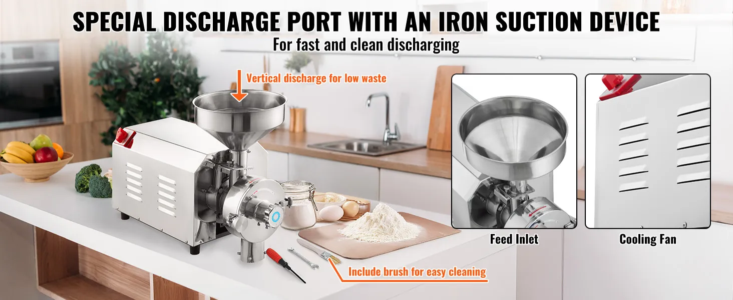 Premium Stainless Steel: This commercial corn grinder mill adopts premium stainless steel material with a smooth surface, avoiding powder accumulation on the inside wall. The structure features good corrosion and rust prevention. It is easy to clean for long service life. This electric grain mill grinder fits your kitchen perfectly with its attractive appearance. It is used for dry grain, not for wet and oily grain.