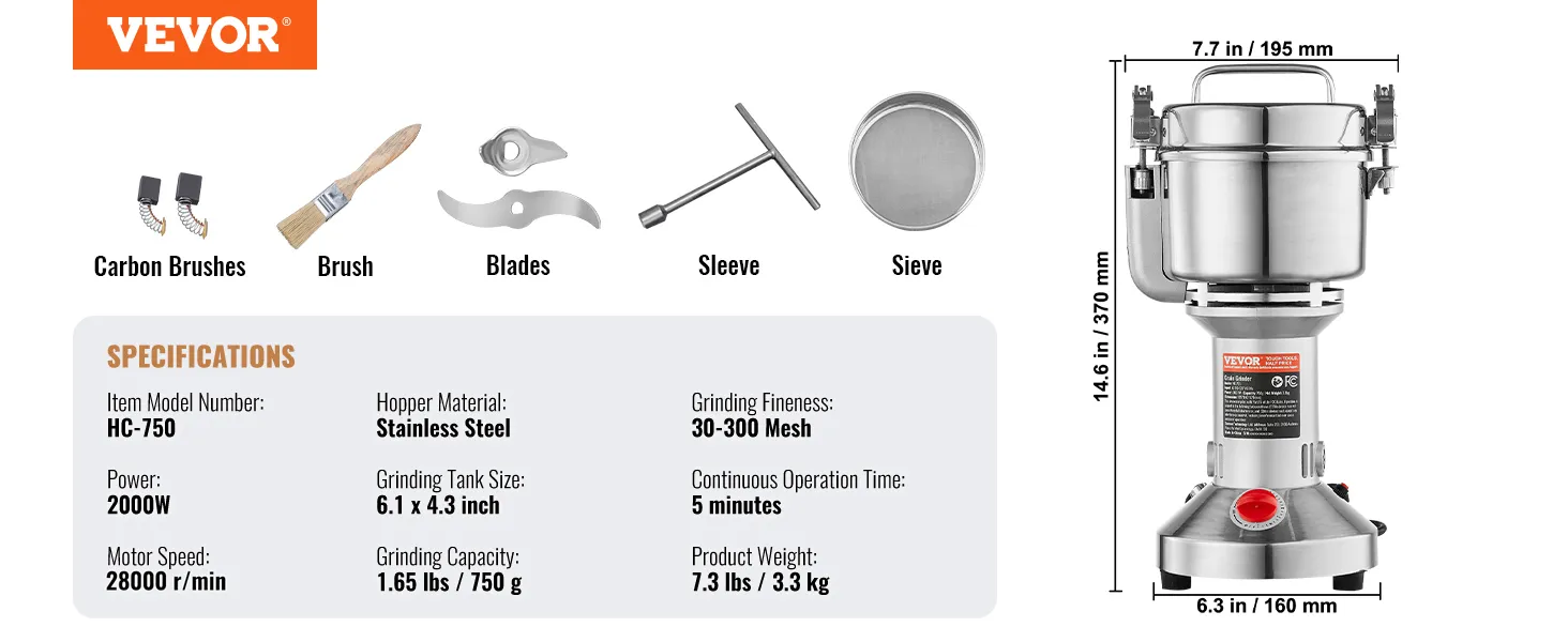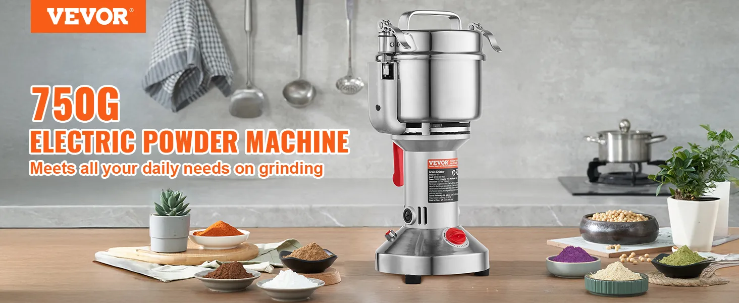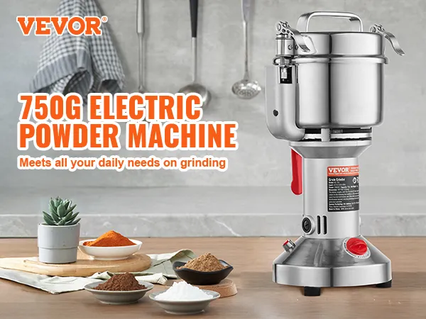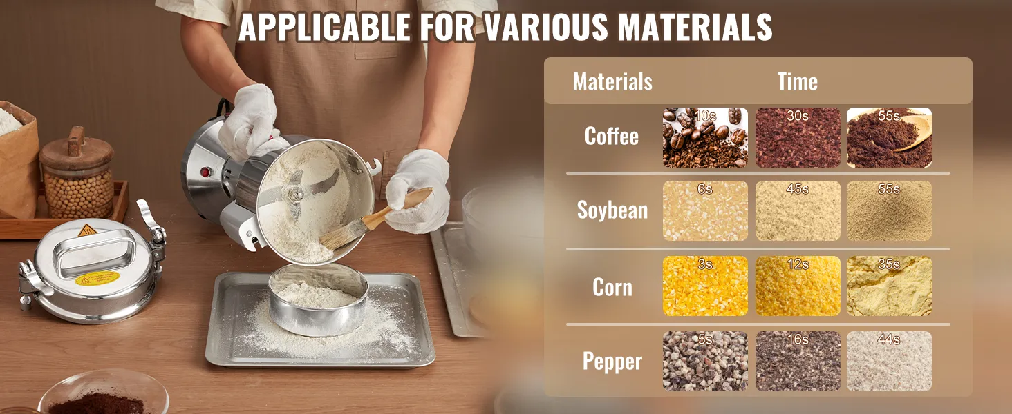 Multifunctionele droogmolen: de poedermachine kan verschillende gedroogde materialen verwerken, waaronder ① granen (soja, maïs, gerst, tarwe, haver, rogge, erwten, koffiebonen), ② specerijen (venkel, peper, kaneel, rozemarijn) ③ andere (Als je andere nodig hebt. Als je harde materialen slijpt, snij ze dan eerst in kleine stukjes.) (Niet geschikt voor natte, verse, olieachtige of plakkerige materialen.) Het wordt veel gebruikt in huizen, keukens, ziekenhuizen en medicijnverwerkingsfabrieken.