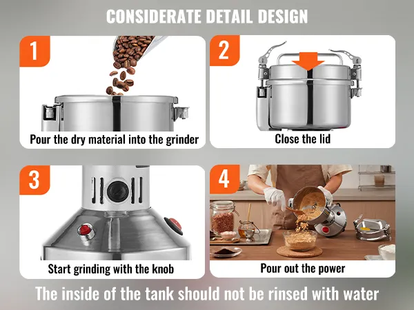 Tips voor gebruik: 1. Deze commerciële koffiemolen kan alleen worden ingeschakeld nadat het deksel volledig gesloten is. 2. De te malen materialen moeten voldoende droog zijn. 3. Laat de machine na elke 5 minuten gebruik 5-10 minuten rusten. 4. Zorg ervoor dat het maalmateriaal het lange mes en niet meer dan 2/3 van de container bedekt. 5. Maak de maalcontainer niet rechtstreeks met water schoon. Gebruik in plaats daarvan een droge doek of borstel om de machine schoon te maken.