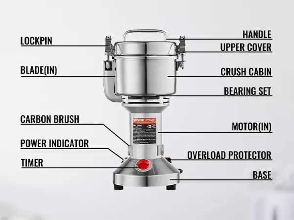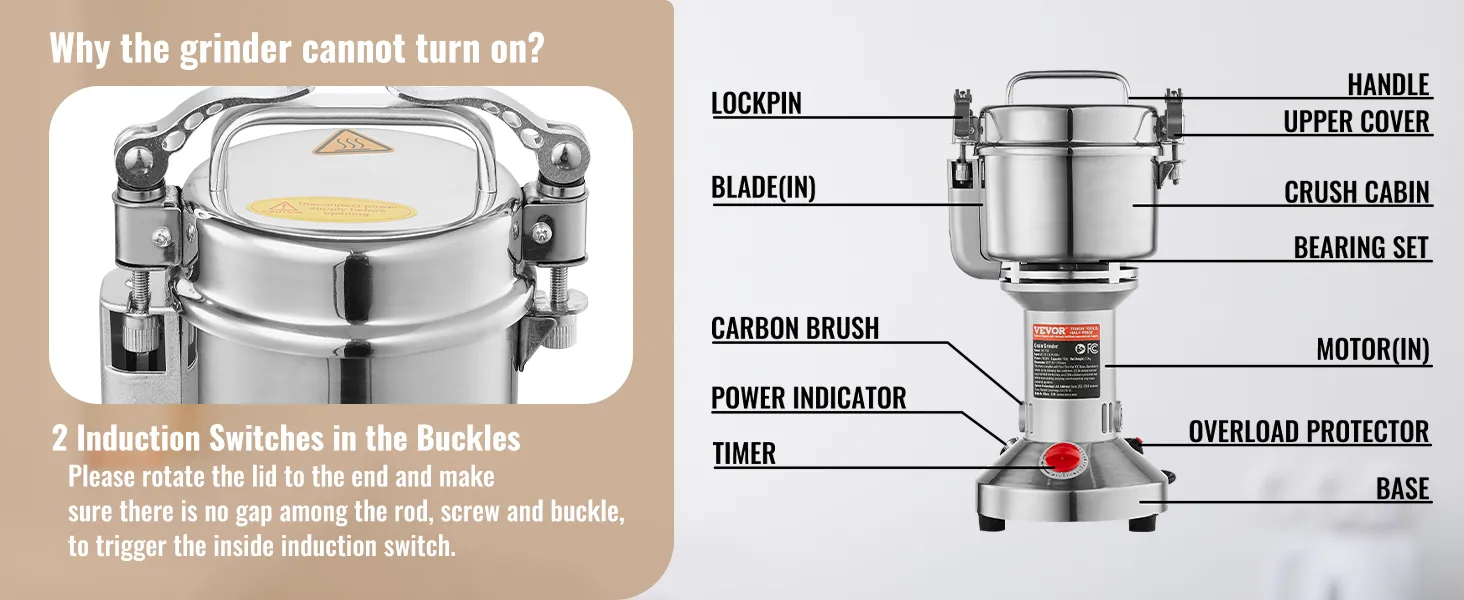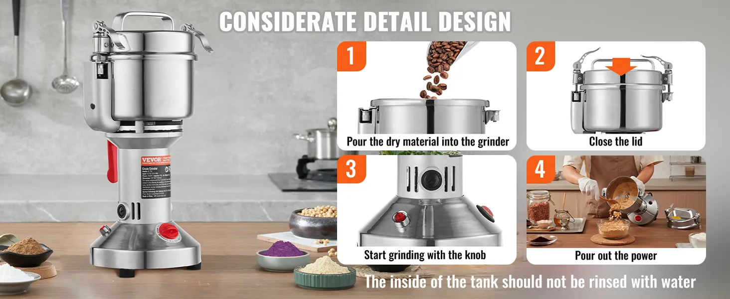Verbeterd dubbel veiligheidsontwerp: de tarwemolen stopt automatisch wanneer het deksel wordt geopend, wat de veiligheid verhoogt en de gebruiker tegen letsel beschermt. Wanneer de graanmolen overbelast is, wordt de overbelastingsbeveiliging automatisch geactiveerd om de werking te controleren. Bovendien is de poedermolen eenvoudig te gebruiken met een timer van 0-5 minuten.