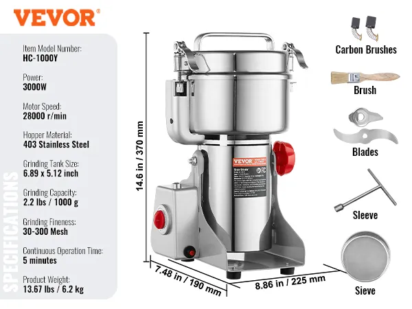Super Smash-functie: Motorvermogen: 3000 W; Motortoerental: 28000 (tpm); Capaciteit: 1000 g; Bedrijfstijd: 5 minuten; Intervaltijd: 10 min; Maalgraad: superfijn; Principe: hogesnelheidsmolen. Prestaties: 30-300 steken. Drielaags mes met hakmes, hoornmes en kruitafstandsmeter. Het duurt slechts 30 seconden om allerlei soorten gedroogd voedsel tot fijn poeder te malen. De kruiden- en zadenmolen is eenvoudig in te stellen en de tijd is af te lezen op het display.