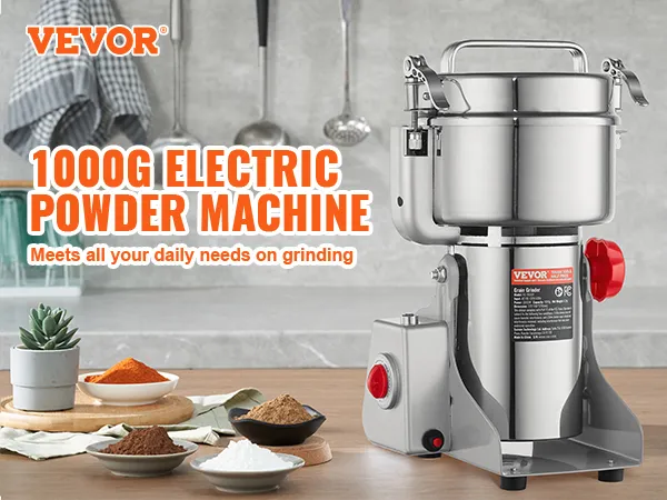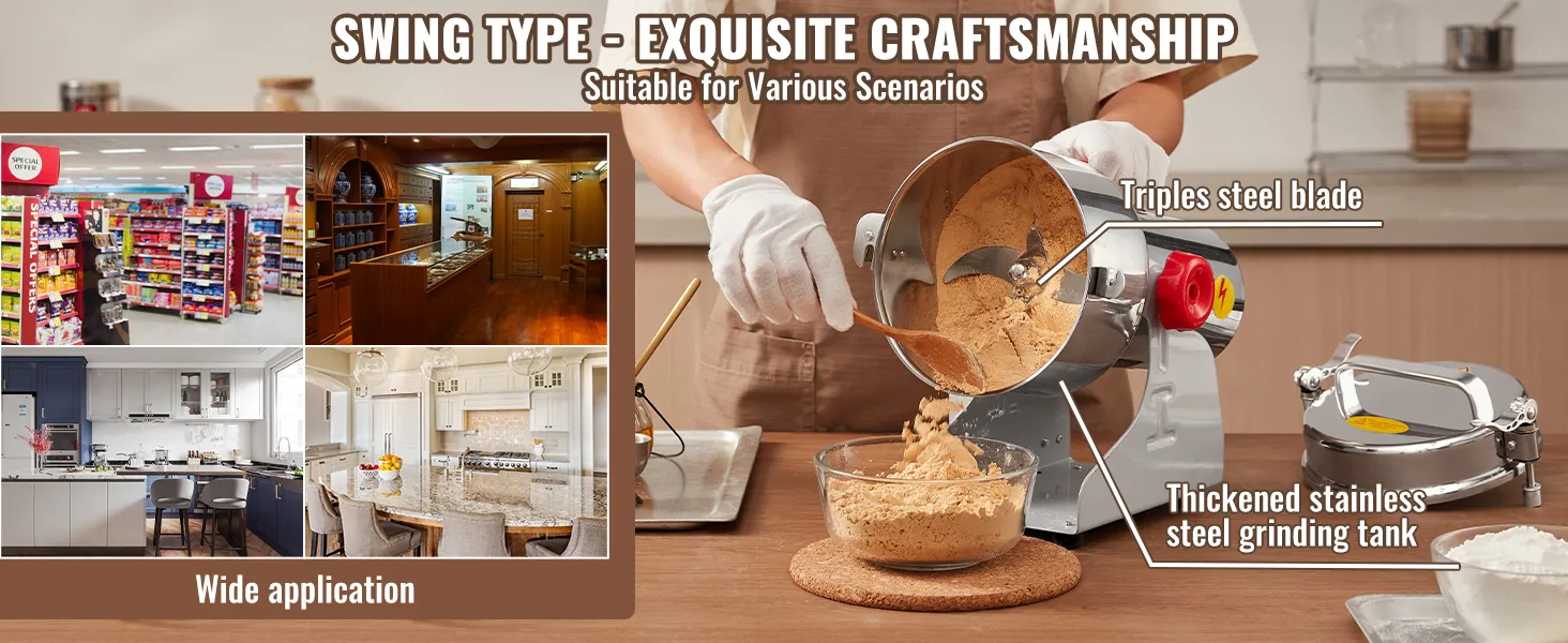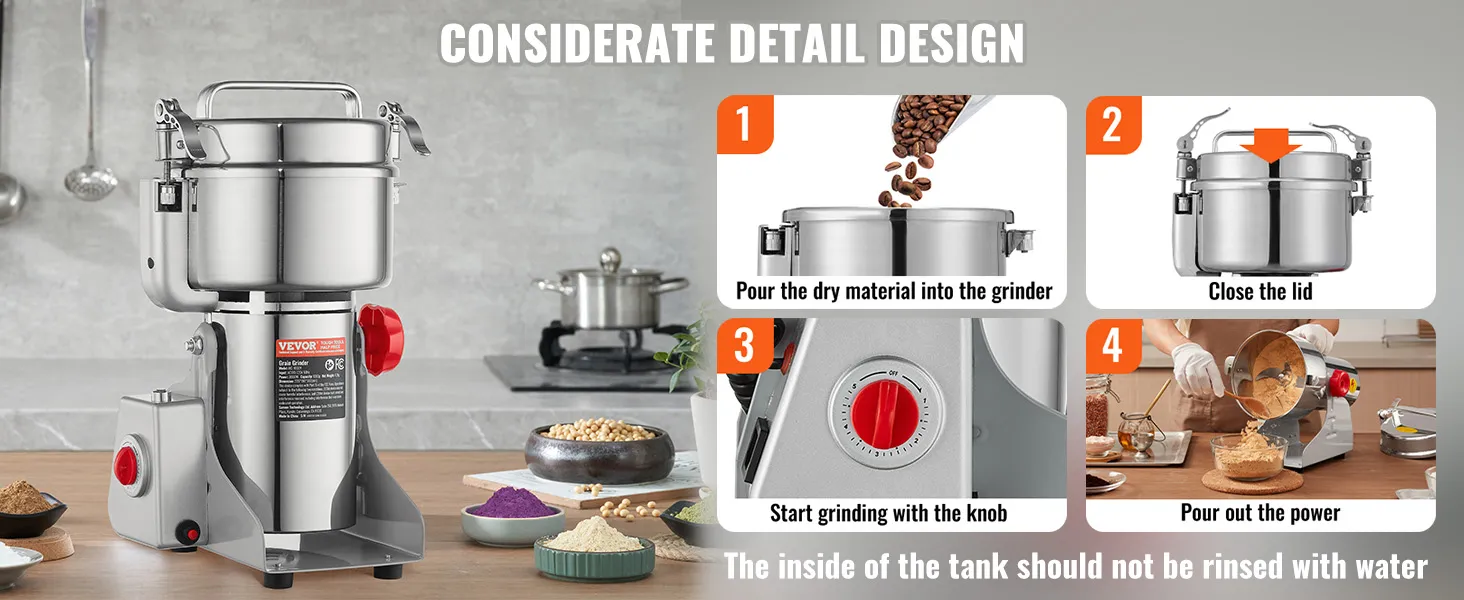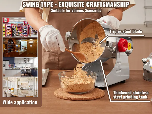 Multifunctionele droogmolen: de poedermachine kan verschillende gedroogde materialen verwerken, waaronder ① granen (soja, maïs, gerst, tarwe, haver, rogge, erwten, koffiebonen), ② specerijen (venkel, peper, kaneel, rozemarijn), ( Niet geschikt voor natte, verse, olieachtige of plakkerige materialen.) Het wordt veel gebruikt in huizen, keukens, ziekenhuizen en farmaceutische verwerkingsfabrieken.
