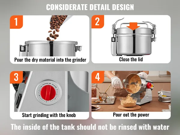 Gebruiksaanwijzing: 1. Deze commerciële koffiemolen mag alleen worden ingeschakeld als het deksel volledig gesloten is. 2. Het grondmateriaal moet voldoende droog zijn. 3. Laat de machine na elke 5 minuten gebruik 5 tot 10 minuten rusten. 4. Zorg ervoor dat de maling het lange mes en niet meer dan 2/3 van de container bedekt. De helft van de container is het beste. 5. Maak de maalcontainer niet rechtstreeks met water schoon. Gebruik een droge doek of borstel om schoon te maken.