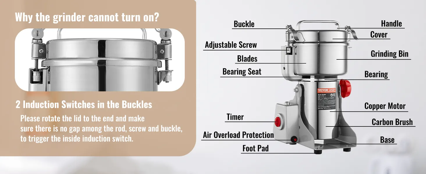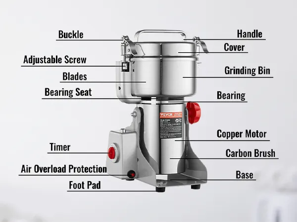 Materiaal van roestvrij staal en veilig ontwerp: de kleine elektrische kruidenmolen is gemaakt van roestvrij staal van voedingskwaliteit en wordt gekenmerkt door zijn duurzaamheid en vrijheid van verontreiniging. De behuizing is goed afgesloten en biedt een hoog beveiligingsniveau. De graanmolen stopt automatisch wanneer het deksel wordt geopend, waardoor de veiligheid wordt vergroot en de gebruiker tegen letsel wordt beschermd. Wanneer de molen overbelast is, wordt de overbelastingsbeveiliging automatisch geactiveerd om de werking te regelen.
