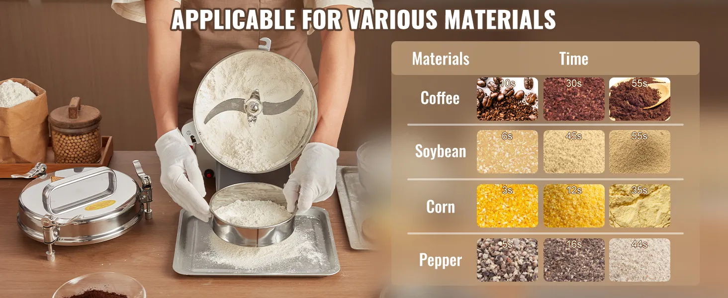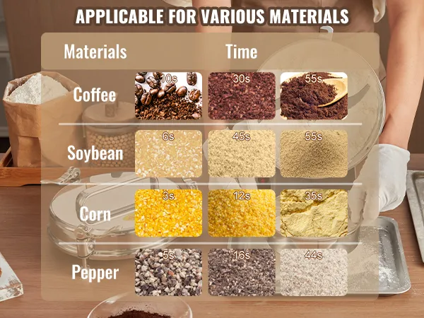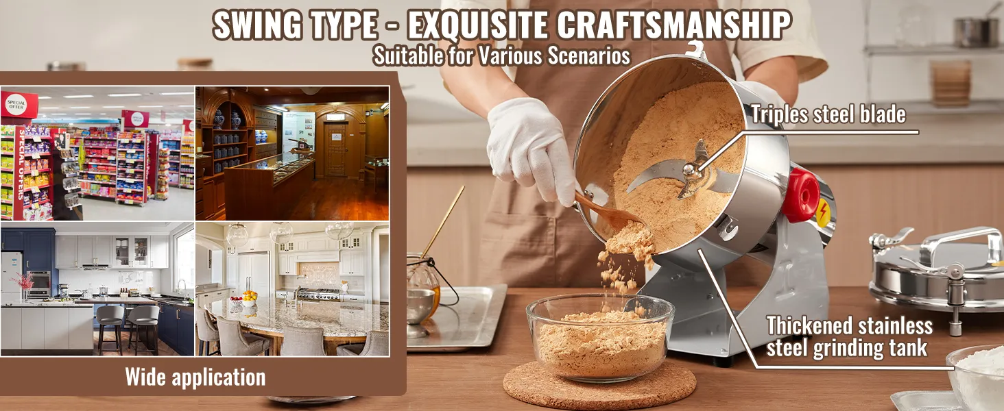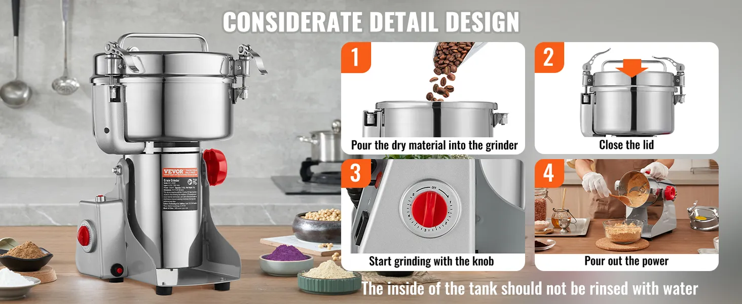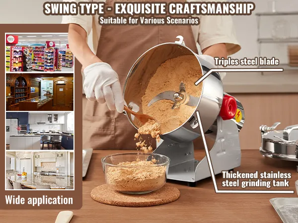 Multifunctionele droogmolen: de poedermachine kan verschillende gedroogde materialen verwerken, waaronder ① granen (soja, maïs, gerst, tarwe, haver, rogge, erwten, koffiebonen), ② specerijen (venkel, peper, kaneel, rozemarijn), ( Niet geschikt voor natte, verse, olieachtige of plakkerige materialen.) Het wordt veel gebruikt in huizen, keukens, ziekenhuizen en farmaceutische verwerkingsfabrieken.