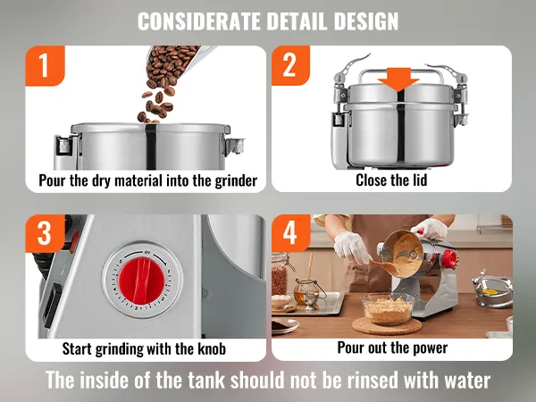 Gebruiksaanwijzing: 1. Deze commerciële koffiemolen mag alleen worden ingeschakeld als het deksel volledig gesloten is. 2. Het grondmateriaal moet voldoende droog zijn. 3. Laat de machine na elke 5 minuten gebruik 5 tot 10 minuten rusten. 4. Zorg ervoor dat de maling het lange mes en niet meer dan 2/3 van de container bedekt. De helft van de container is het beste. 5. Maak de maalcontainer niet rechtstreeks met water schoon. Gebruik een droge doek of borstel om schoon te maken.