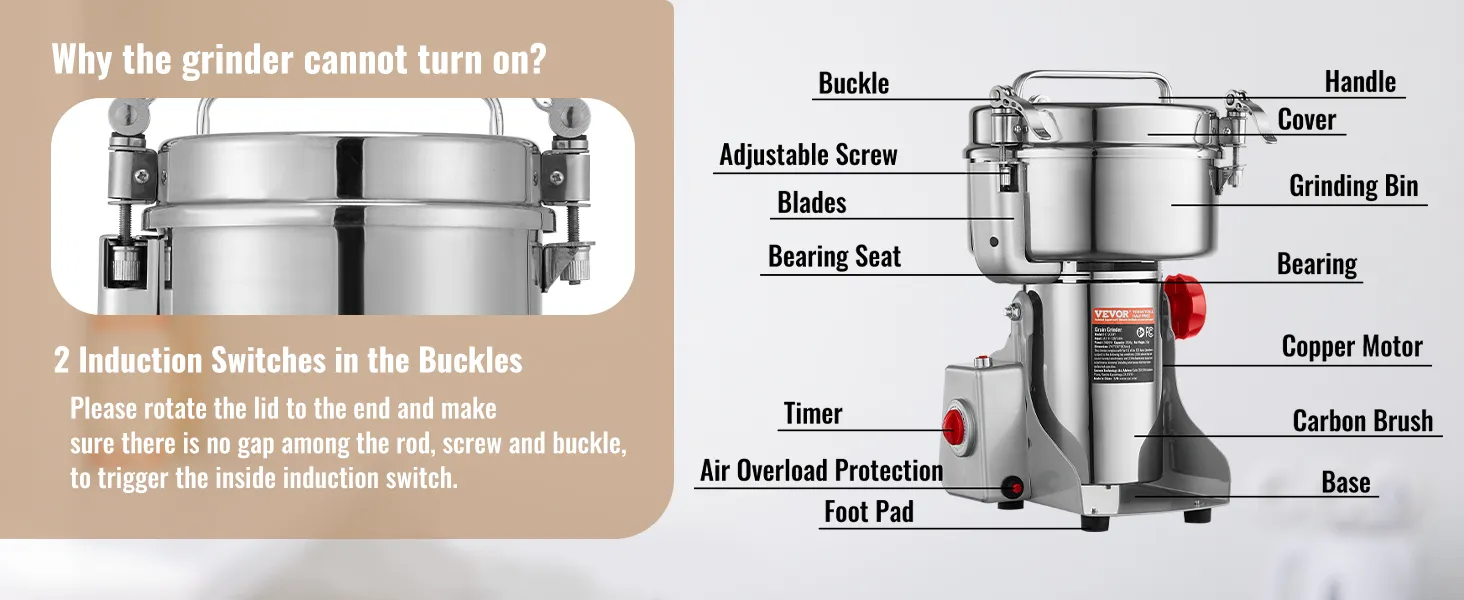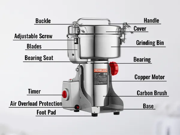Materiaal van roestvrij staal en veilig ontwerp: de kleine elektrische kruidenmolen is gemaakt van roestvrij staal van voedingskwaliteit en wordt gekenmerkt door zijn duurzaamheid en vrijheid van verontreiniging. De behuizing is goed afgesloten en biedt een hoog beveiligingsniveau. De graanmolen stopt automatisch wanneer het deksel wordt geopend, waardoor de veiligheid wordt vergroot en de gebruiker tegen letsel wordt beschermd. Wanneer de molen overbelast is, wordt de overbelastingsbeveiliging automatisch geactiveerd om de werking te regelen.