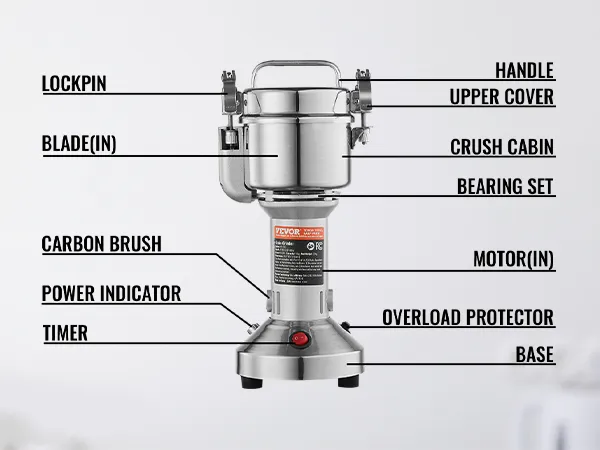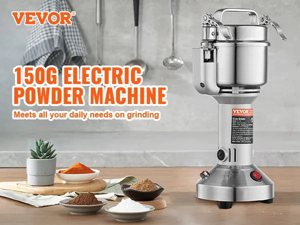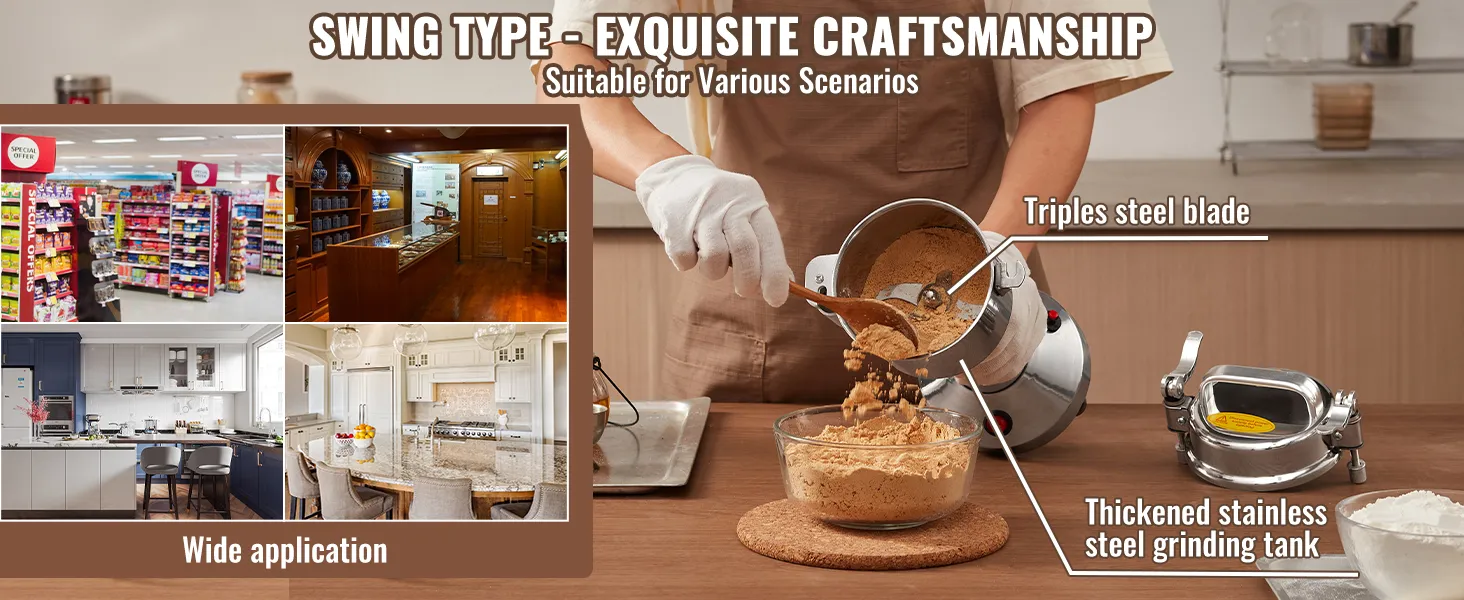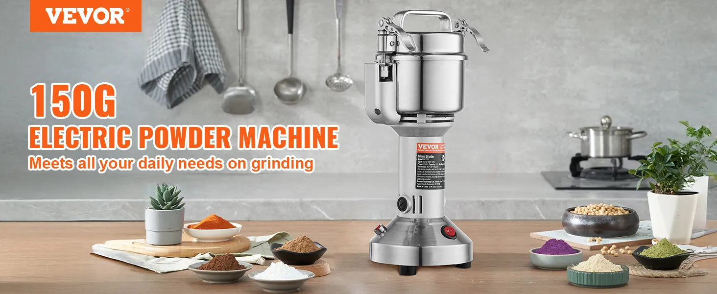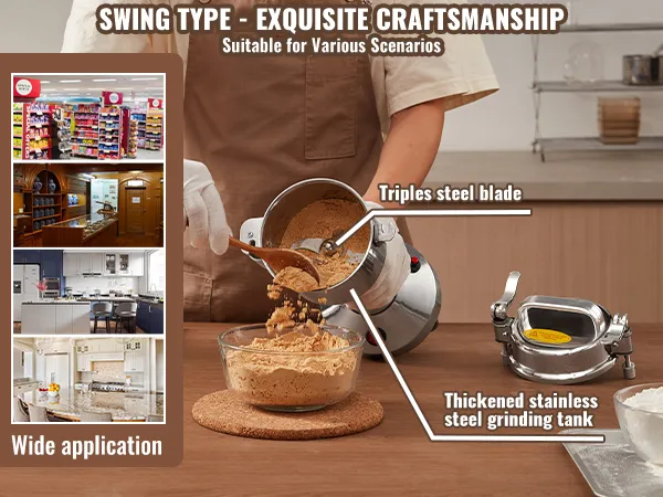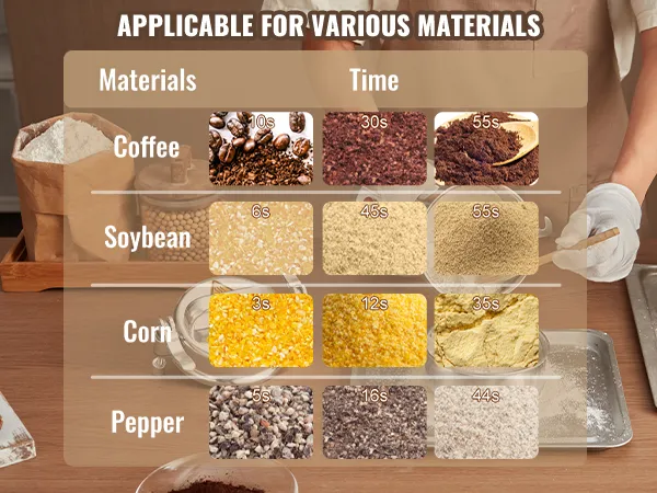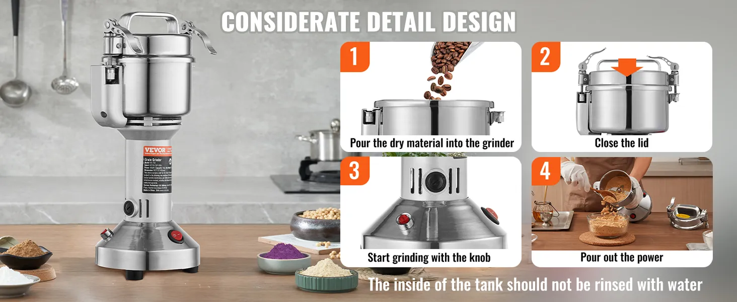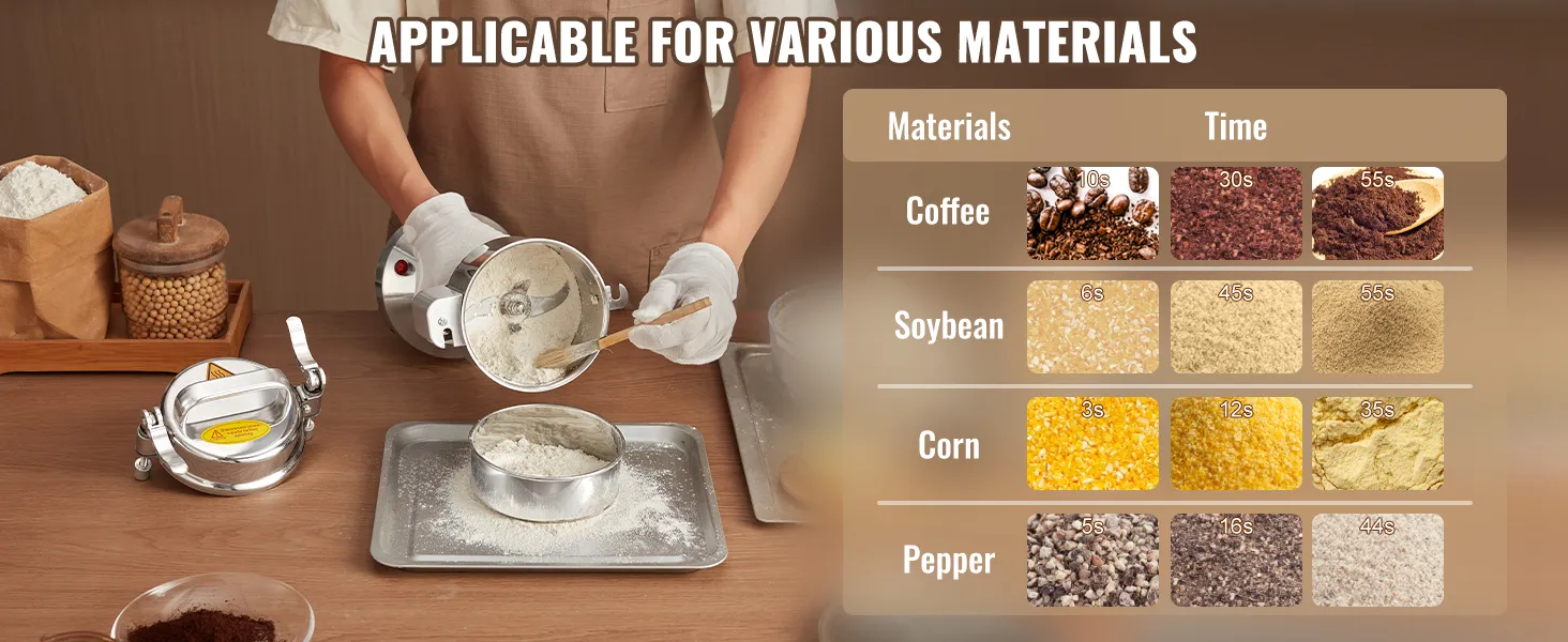 Multifunctionele droogmolen: de poedermachine kan verschillende gedroogde materialen verwerken, waaronder ① granen (soja, maïs, gerst, tarwe, haver, rogge, erwten, koffiebonen) ② specerijen (venkel, peper, kaneel, rozemarijn) ③ andere ( als je andere harde materialen hebt, snij ze dan eerst in kleine stukjes). (Niet geschikt voor natte, verse, olieachtige of plakkerige materialen.) Veel gebruikt in huizen, keukens, ziekenhuizen en farmaceutische fabrieken.